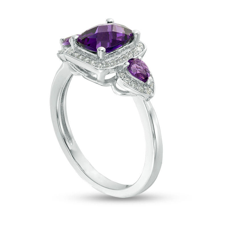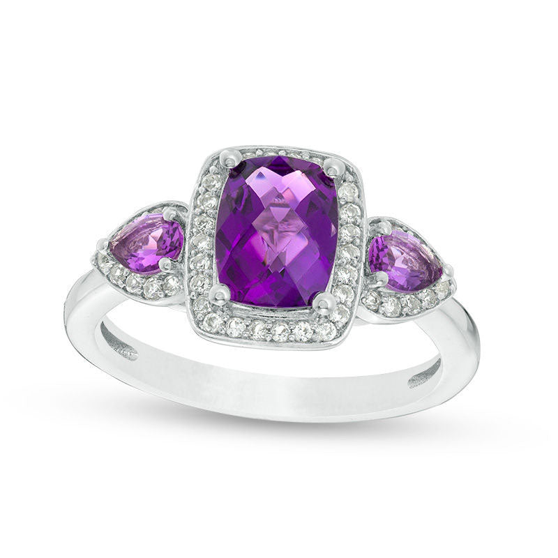 This sterling silver ring is a true gem that will bring a touch of elegance to any outfit. The stunning centerpiece is an 8.0 x 6.0mm cushion-cut amethyst in a vibrant purple, complemented by two 4 x 3.0mm pear-shaped amethysts on either side. The gemstones are surrounded by a frame of dazzling lab-created white sapphires that shimmer from every angle. This three-stone design is simply irresistible and will catch the eye of all who see it. This ring is custom-made to fit her exact ring size and is buffed to a brilliant luster. Please note that sterling silver rings cannot be resized after purchase.