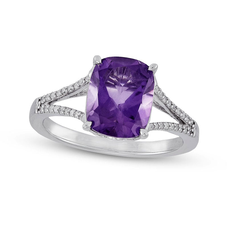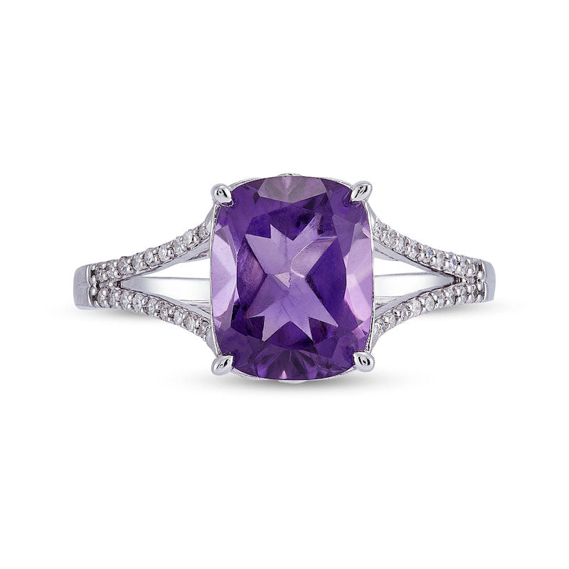 Cushion-Cut Faceted Amethyst and 0.13 CT. T.W. Natural Diamond Split Shank Ring in Solid 10K White Gold - Size 7
