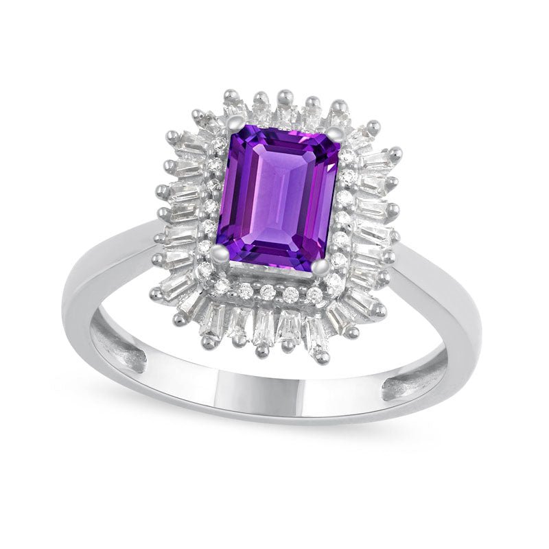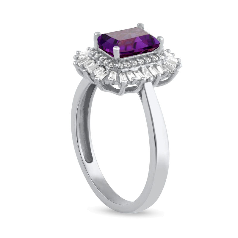 Emerald-Cut Amethyst and 0.25 CT. T.W. Baguette and Round Natural Diamond Double Frame Ring in Solid 10K White Gold