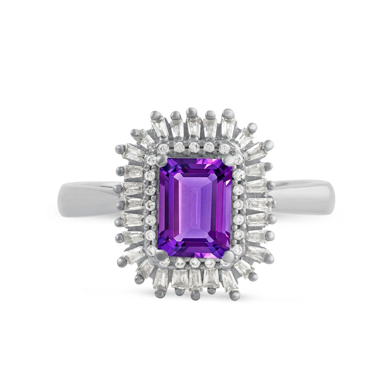 Bring a touch of glamour and elegance to your collection with this stunning Emerald-Cut Amethyst and Diamond Double Frame Ring. Crafted in shiny 10K white gold, this piece is the epitome of sophistication. The center of attention is a mesmerizing 7.0 x 5.0mm emerald-cut amethyst, nestled within a stylish double octagon-shaped frame. The frame is beautifully embellished with a combination of round and baguette-cut diamonds, adding a sparkling touch to the design. This magnificent ring boasts a total diamond weight of 1/4 ct. t.w. and a brilliant buffed luster, making it the perfect choice for special occasions or to simply elevate your everyday look.