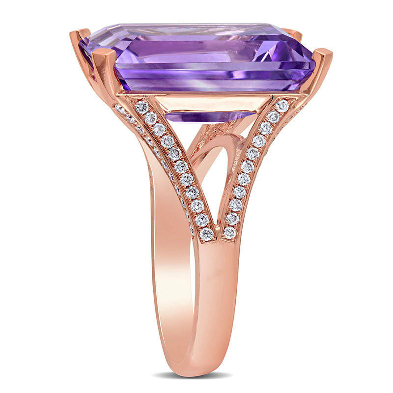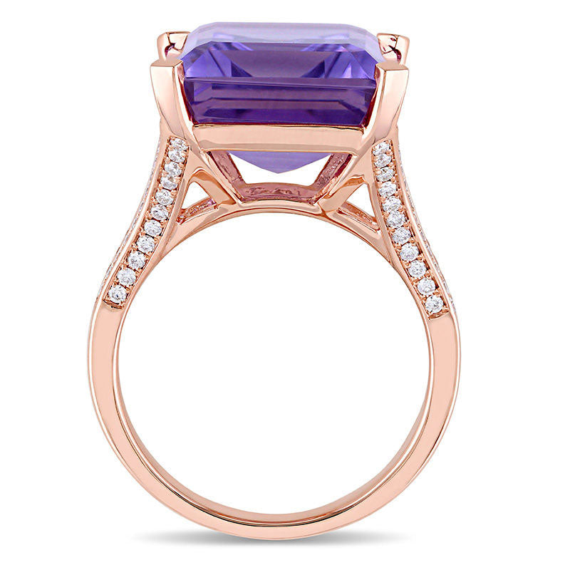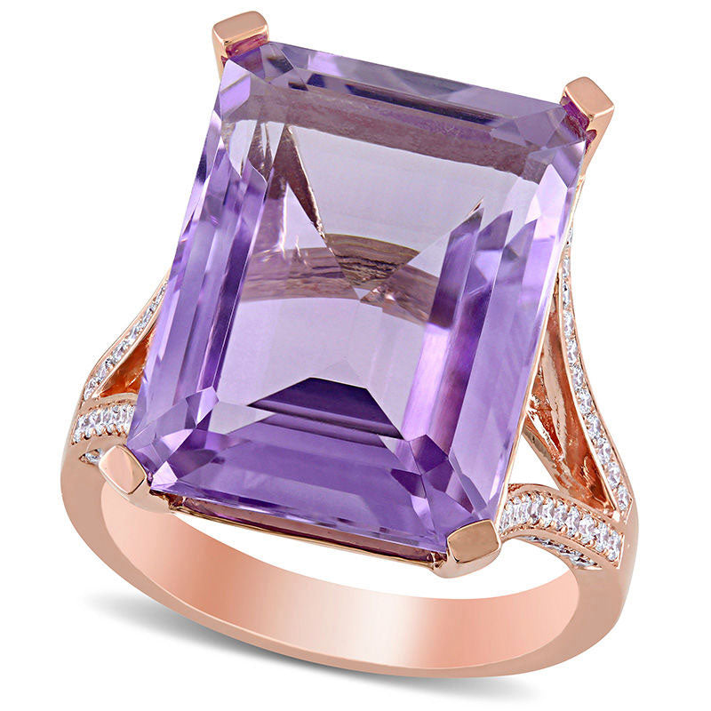 Be the center of attention with this stunning amethyst and diamond ring. Crafted in 14K rose gold, this romantic ring showcases a gorgeous 18.0 x 13.0mm emerald-cut amethyst in a vivid purple hue. The split shank design is embellished with sparkling diamonds on both sides, with each diamond boasting a color rank of H and clarity of SI2, to create a dazzling effect. With a total diamond weight of 3/8 ct. and a brilliant buffed luster, this ring is sure to catch every eye. Make a statement with this breathtaking piece.