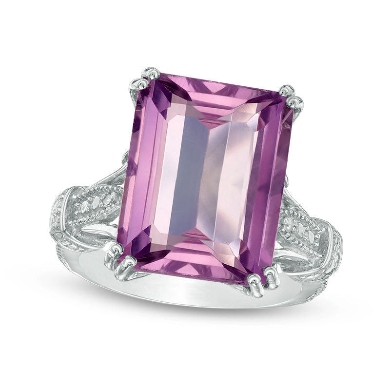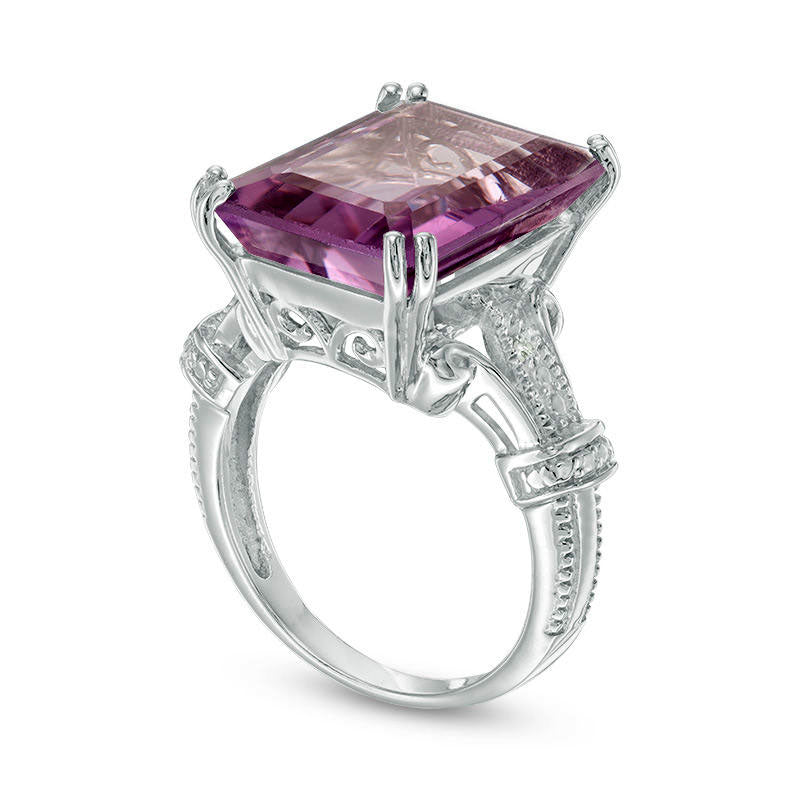 'Impressively bold and oozing with class, this vintage-inspired ring is the ultimate accessory to complete her formal attire. Made of high-quality sterling silver, this exceptional jewelry features a stunning 16.0 x 12.0mm emerald-cut amethyst at the center, beautifully encased in a deep four-prong setting. Both sides of the uniquely ornamented shank are adorned with sparkling diamond accents, intricate milgrain accents, and delicate beaded collars, and the bezel is artfully fashioned with dainty scrollwork for a polished finish. Meticulously crafted and guaranteed to turn heads, this exceptional piece is the perfect addition to any knockout outfit. Custom fitted to her finger size, please note that sterling silver rings cannot be resized after purchase.'
