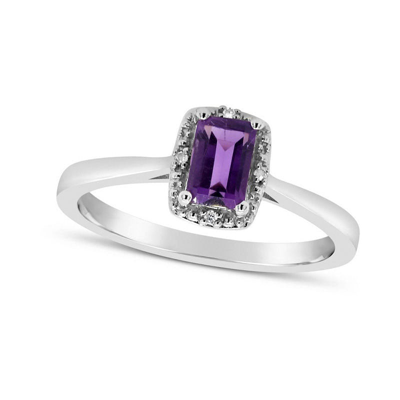 This stunning piece of jewelry is a must-have to complete any look. The Emerald-Cut Amethyst and Diamond Accent Beaded Frame Ring, made in elegant sterling silver, showcases a vibrant 6.0 x 4.0mm emerald-cut amethyst stone. The intricate bead-detailed frame is accented with diamonds at each compass point, providing a subtle touch of sparkle. Exquisitely polished, this ring is a versatile accessory that will be worn again and again. Available in limited sizes, please keep in mind that sterling silver rings cannot be resized after purchase.