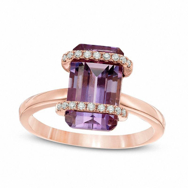 Elevate your style quotient with this modern gemstone ring. Made from exquisite 10K rose gold, this trendy piece showcases a vibrant purple, 12.0 x 7.0mm emerald-cut amethyst sitting at its center, surrounded by two ribbon overlays inlaid with sparkling diamond accents. This statement ring is bound to grab attention and radiates a stunning shine.