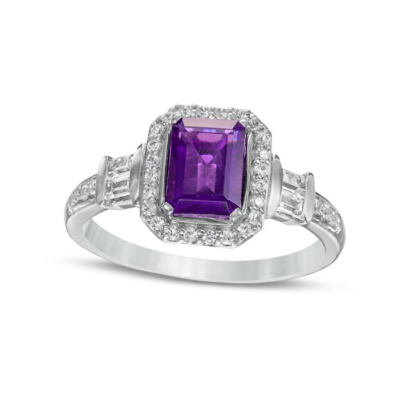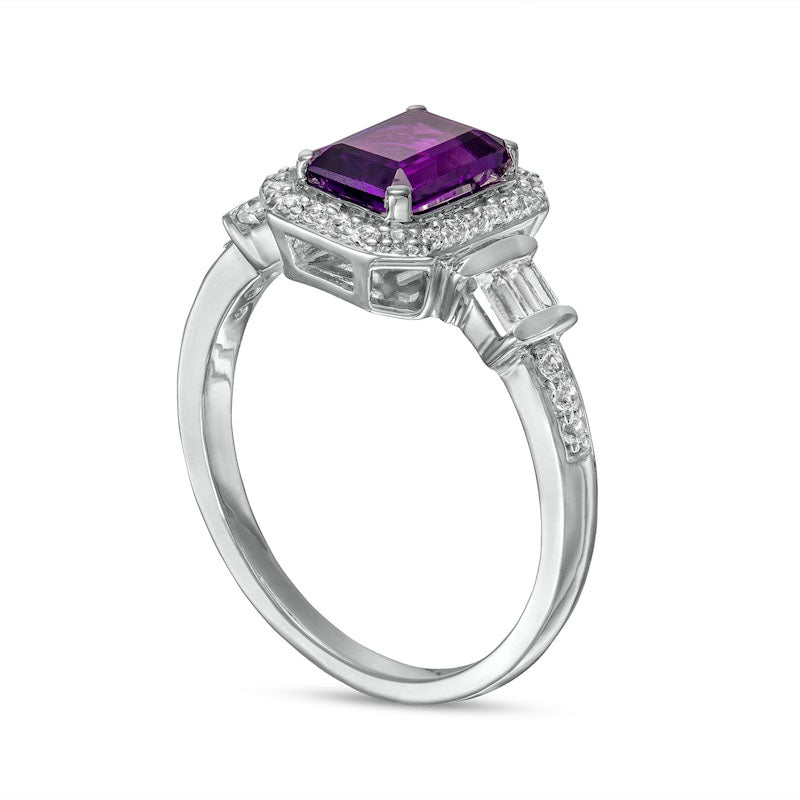 Emerald-Cut Amethyst and White Lab-Created Sapphire Cushion Frame Ring in Sterling Silver