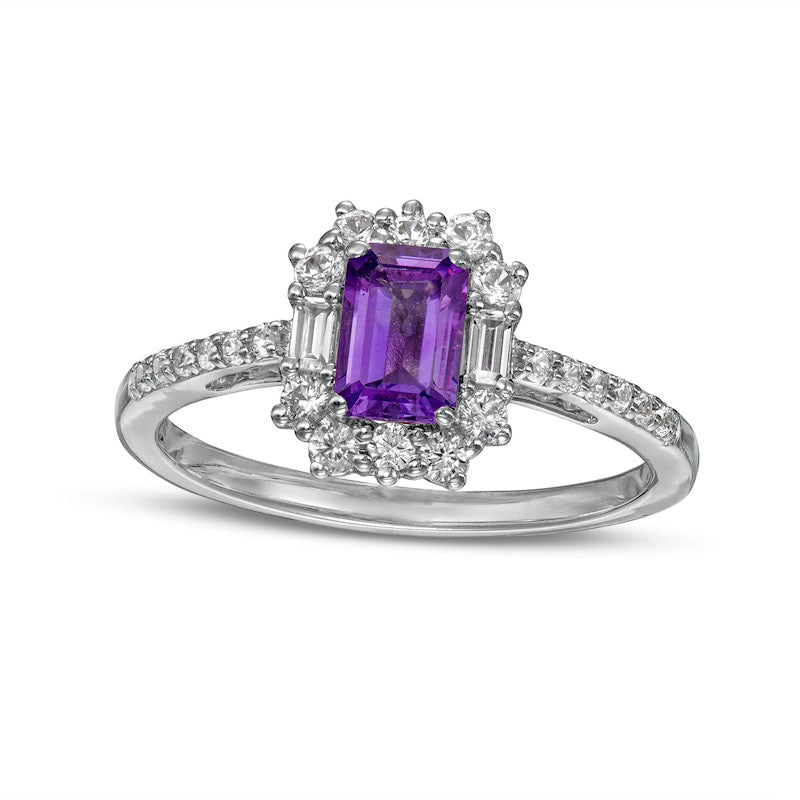 Crafted from premium quality sterling silver, this exquisite ring boasts an ornate frame adorned with radiant white lab-created sapphires. The magnificent centerpiece consists of a captivating 6.0 x 4.0mm emerald-cut amethyst that adds a touch of regal elegance to the piece.