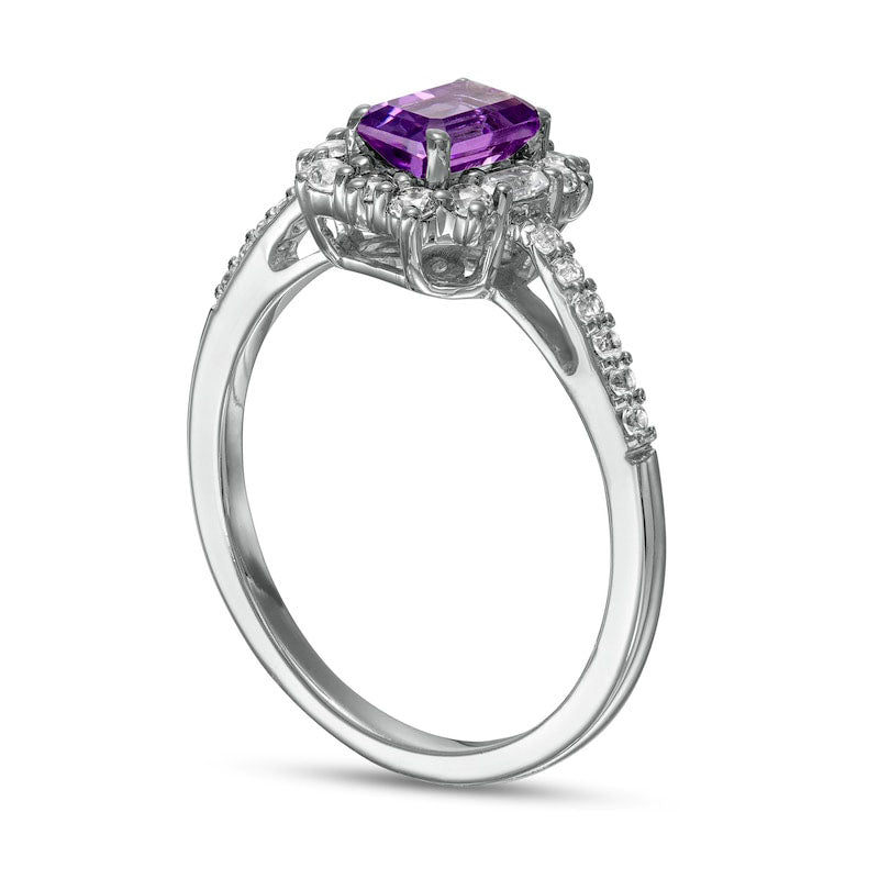 Emerald-Cut Amethyst and White Lab-Created Sapphire Ornate Frame Ring in Sterling Silver