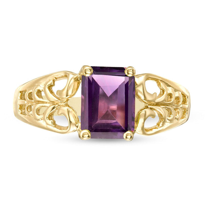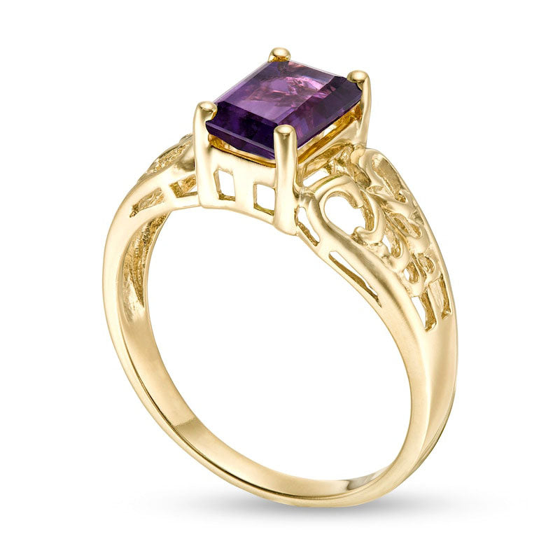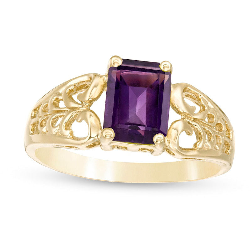 Emerald-Cut Amethyst Open Scroll Ring in Solid 10K Yellow Gold