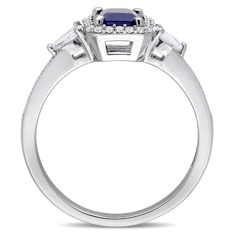 Emerald-Cut Blue and White Sapphire and 0.17 CT. T.W. Natural Diamond Frame Three Stone Engagement Ring in Solid 14K White Gold