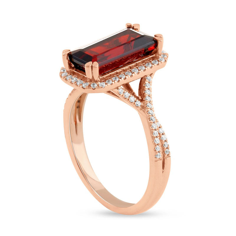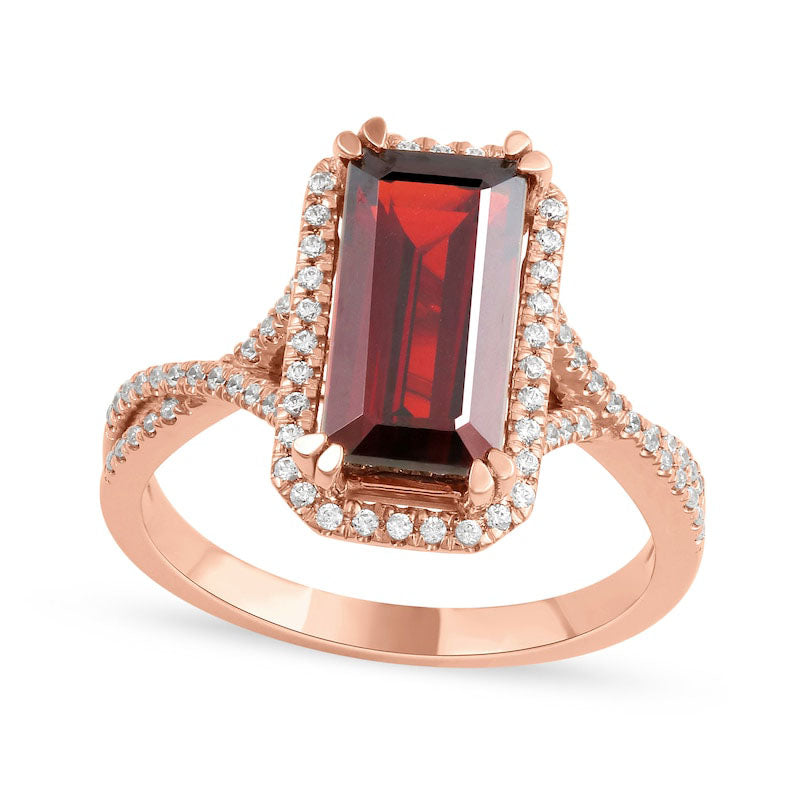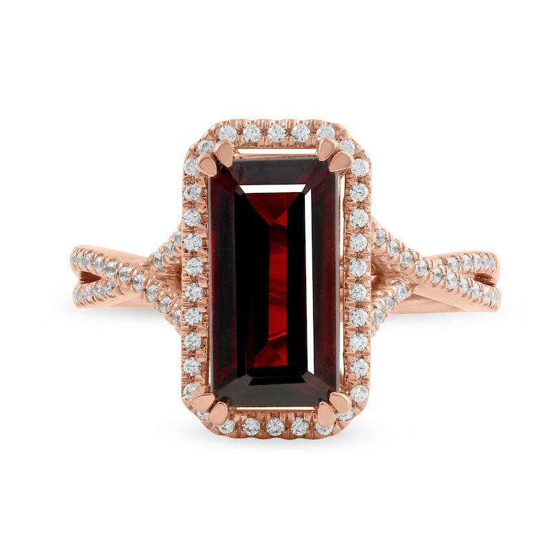 Make an impression with this stunning garnet and diamond ring that exudes confidence. Crafted from 10K rose gold, this exquisite piece showcases a magnificent 12.0 x 6.0mm emerald-cut garnet in regal red, encircled by an octagonal frame adorned with dazzling diamonds. The split shank is crafted as crossover ribbons, which shine with additional diamonds. With a total weight of 1/4 ct. t.w. of diamonds and a polished shine, this ring beautifully complements your individual style. It's a captivating accessory that will elevate any outfit.
