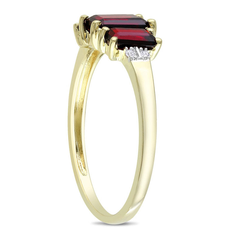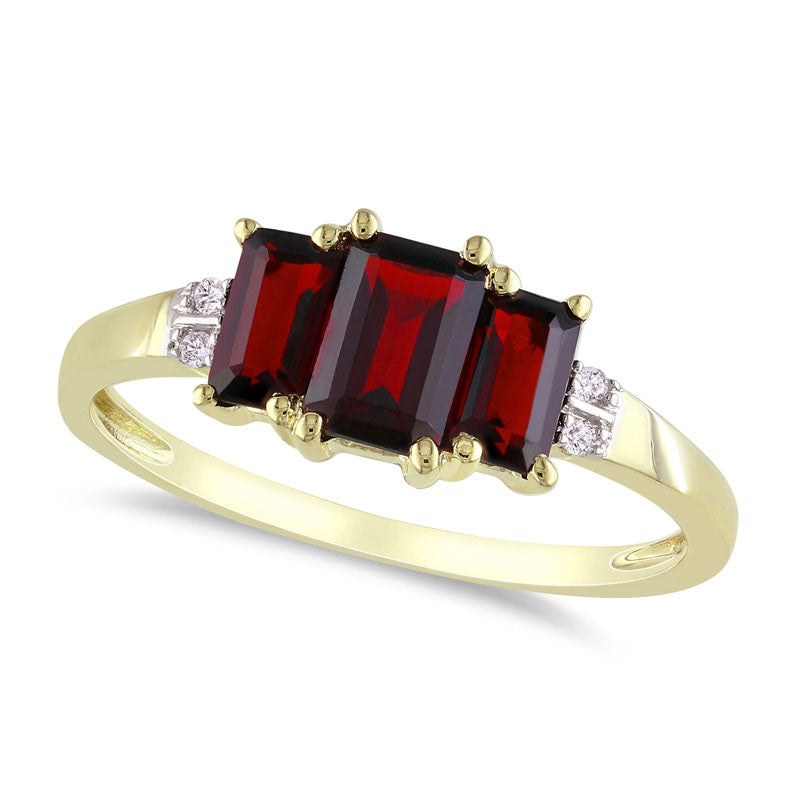 Emerald-Cut Garnet and Natural Diamond Accent Three Stone Ring in Solid 10K Yellow Gold