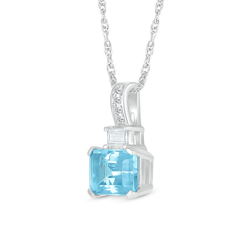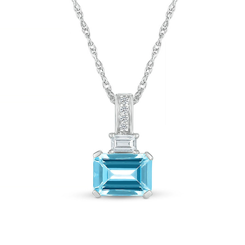 Emerald-Cut Swiss Blue Topaz and Baguette and Round White Lab-Created Sapphire Stacked Pendant in Sterling Silver