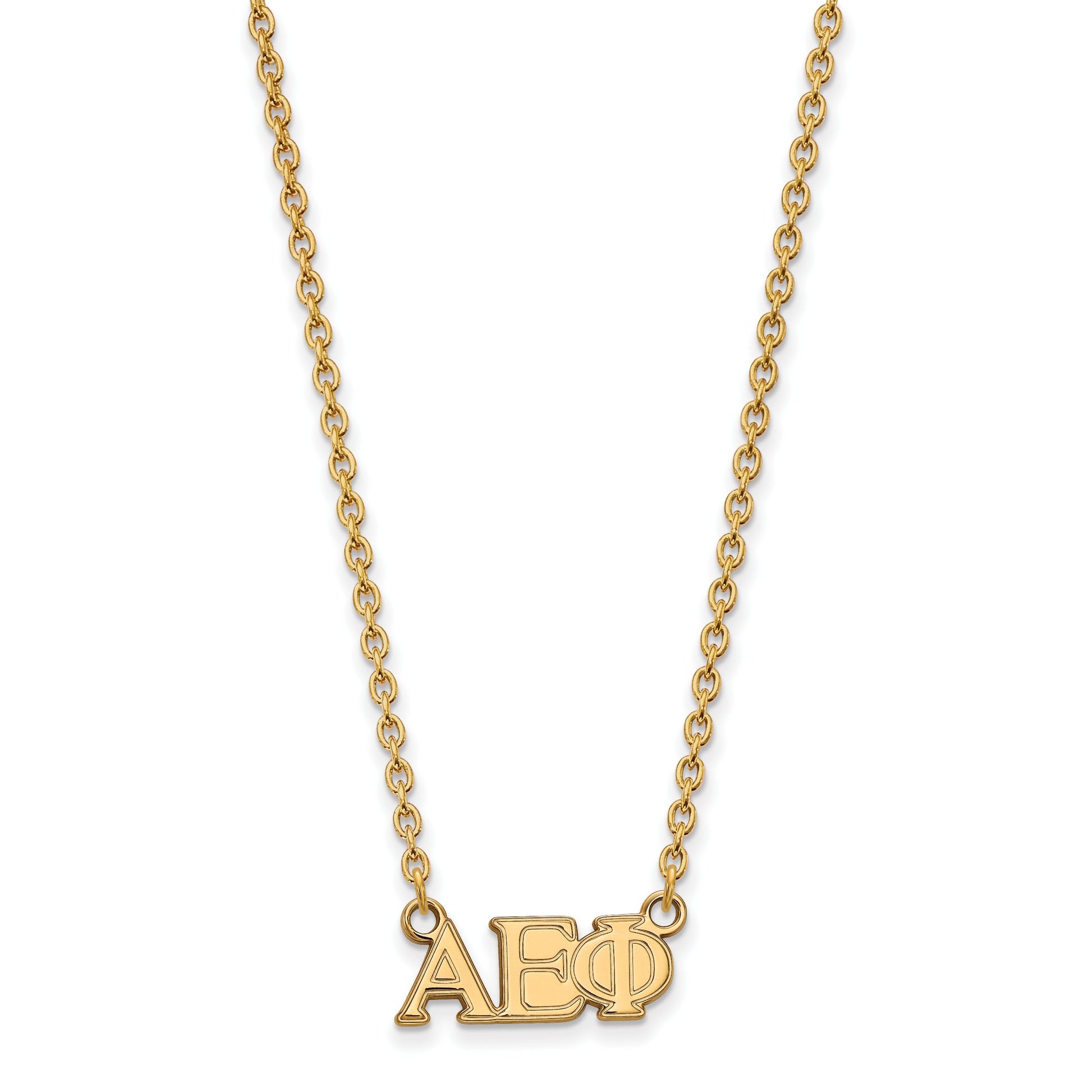 Show off your pride with the Gold-Plated Sterling Silver Alpha Epsilon Phi Necklace. Crafted from high-quality sterling silver, this medium pendant features the sorority’s Greek letters in a sleek, laser-cut design. The bright gold plating adds a touch of elegance to any outfit. The 18-inch cable chain offers a comfortable fit and easy wear, secured with a sturdy lobster clasp. Perfect for everyday or special occasions, the necklace highlights your sisterhood bond. The Alpha Epsilon Phi Gold-Plated Sterling Silver Necklace is a stylish way to celebrate your sorority spirit.