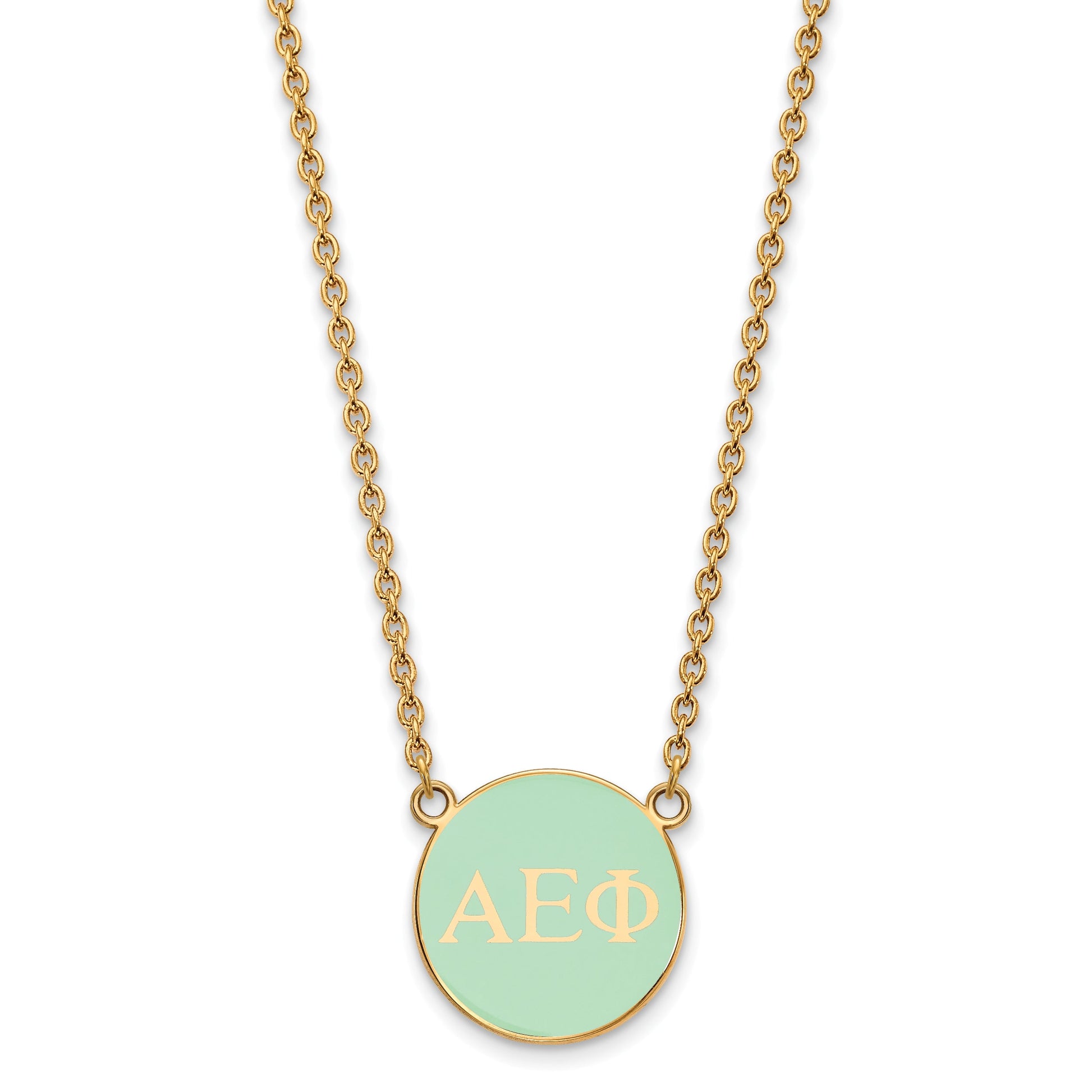 The Gold-Plated Sterling Silver Logoart Alpha Epsilon Phi Necklace is a sleek piece perfect for any sorority pride. Crafted from high-quality sterling silver with a polished finish, it features a vibrant enamel Greek letter charm in green, measuring 18 mm. The 18-inch cable chain offers a comfortable fit and sturdy lobster clasp for secure wear. Designed with laser-cut precision, this small pendant highlights your sisterhood with style and elegance. The Alpha Epsilon Phi Gold-Plated Necklace from LogoArt LLC blends simple charm with a bold statement, making it a must-have for any proud member.