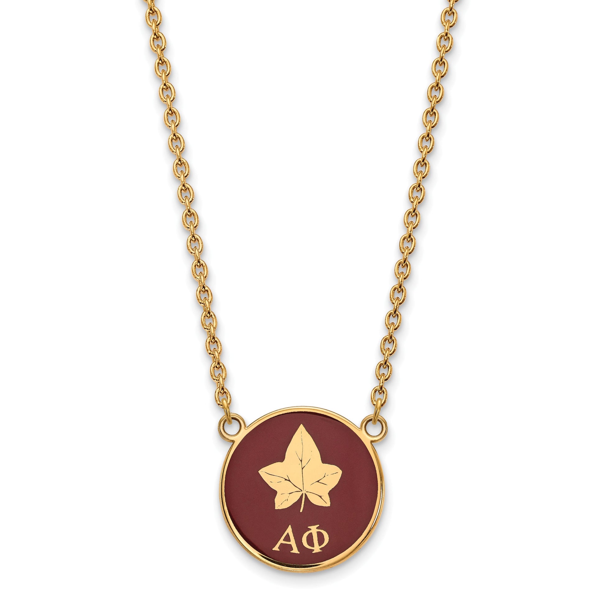Discover the LogoArt Alpha Phi Sorority Necklace, a striking piece crafted from polished sterling silver with a rich gold plating. This bold pendant features a vibrant Bordeaux enamel accent and measures 19 mm, making it a standout addition to any jewelry collection. The 18-inch cable chain offers a comfortable fit and durability, while the laser-cut design adds a modern touch. Perfect for showing off your sorority pride, the large Alpha Phi symbol on this jewelry piece captures attention with its clean look. The LogoArt Alpha Phi Sorority Necklace blends quality and style to keep your spirit shining.