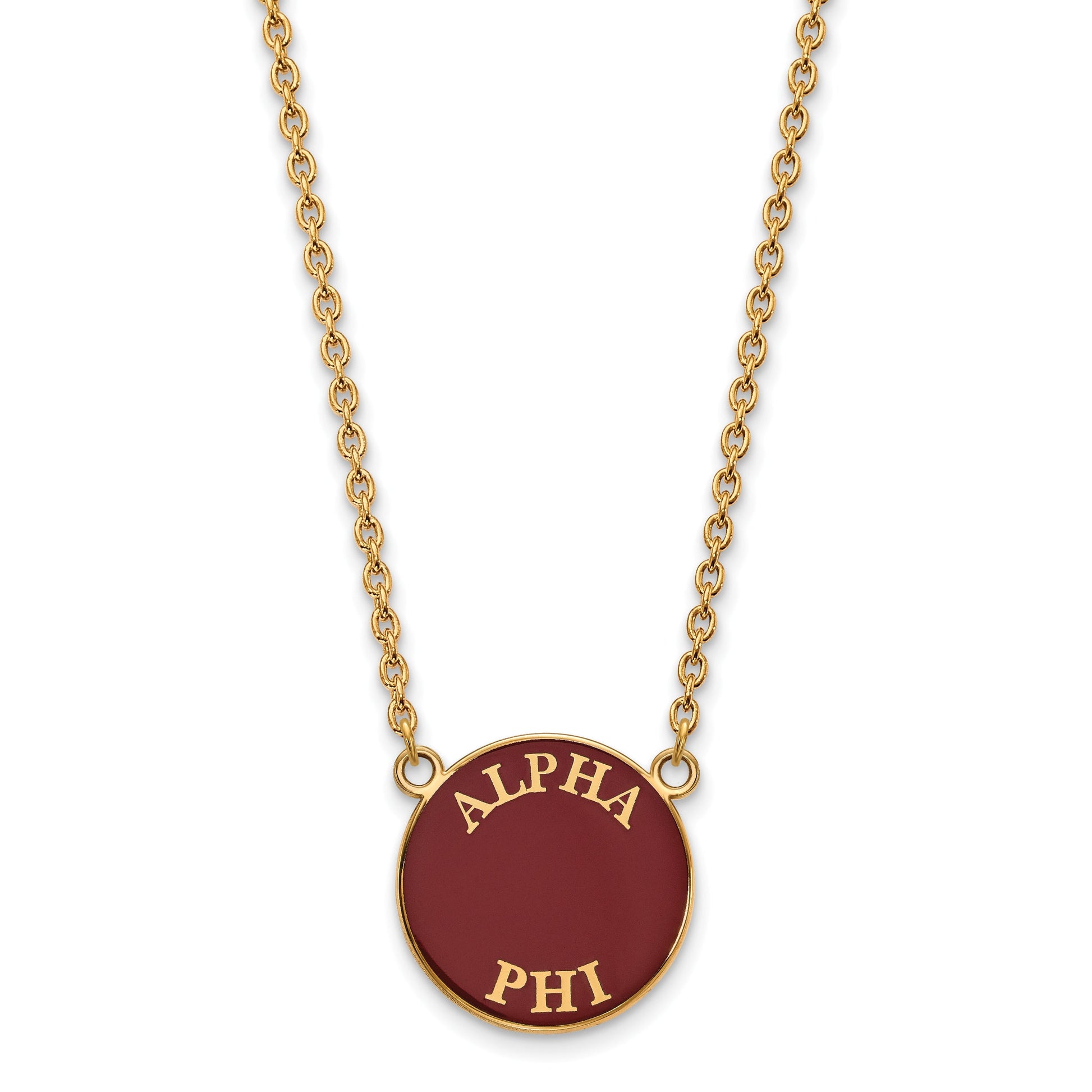 The Gold-Plated LogoArt Alpha Phi Sorority Necklace makes a bold statement of pride. Crafted from high-quality 925 sterling silver with a shiny gold finish, this 18-inch chain includes a large, eye-catching pendant featuring the Alpha Phi logo in striking Bordeaux enamel. Its laser-cut design ensures a clean, sharp look while the cable chain provides a sturdy hold. The pendant measures 19 mm in both height and width, adding a sense of prominence without feeling heavy. Perfect for showing off your sorority spirit, the Gold-Plated LogoArt Alpha Phi necklace blends style and meaning in one elegant piece.