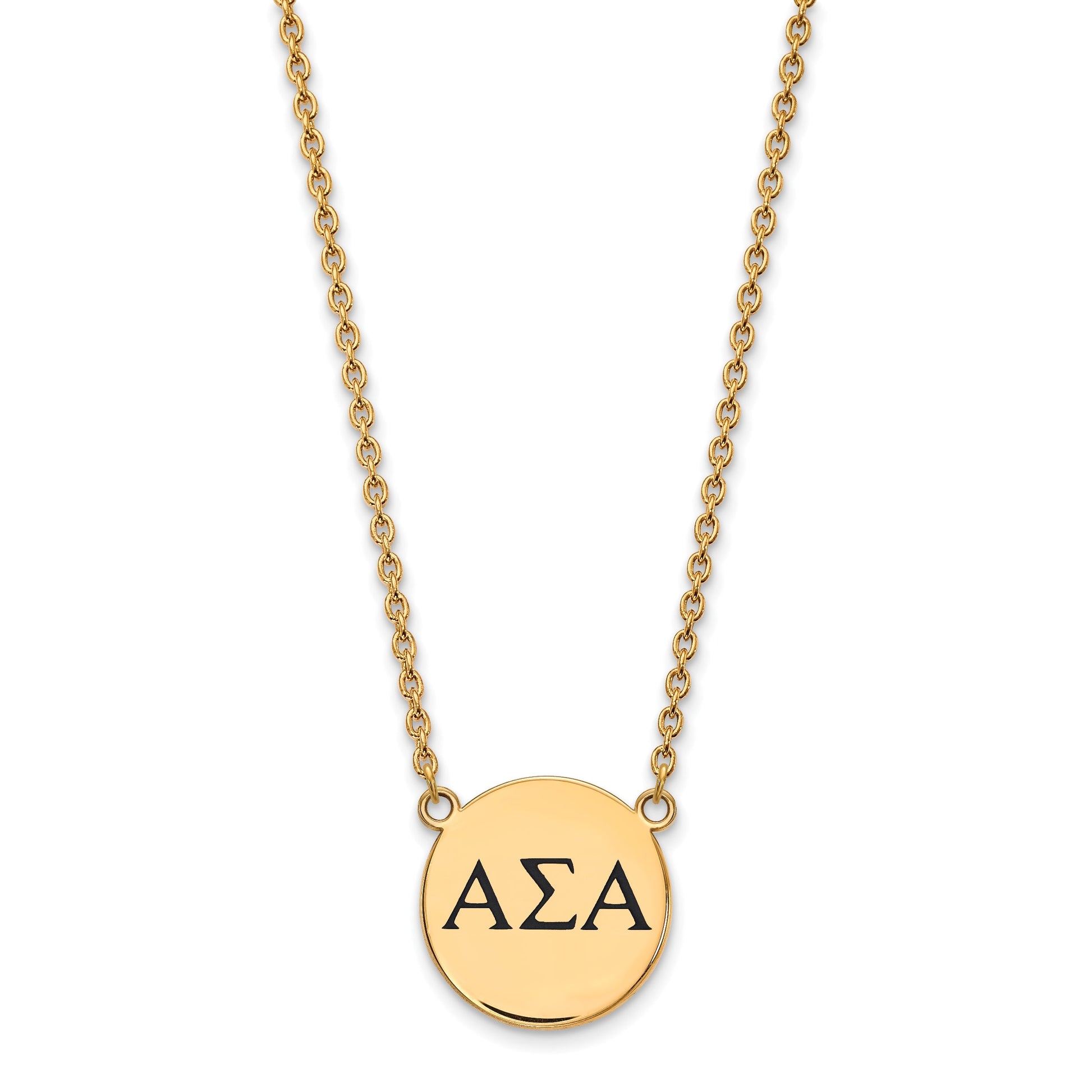 Celebrate your sisterhood with the LogoArt Alpha Sigma Sorority Greek Letters Necklace. Crafted from sterling silver and finished with a bright gold plating, this large pendant features bold black enamel accents that make the Greek letters stand out. With a length of 18 inches, the cable chain completes the look with a sturdy lobster clasp. The laser-cut design ensures precision, and the pendant’s size makes a striking statement. Perfect for daily wear or special events, the LogoArt Alpha Sigma Alpha necklace is a proud symbol of your sorority bond.
