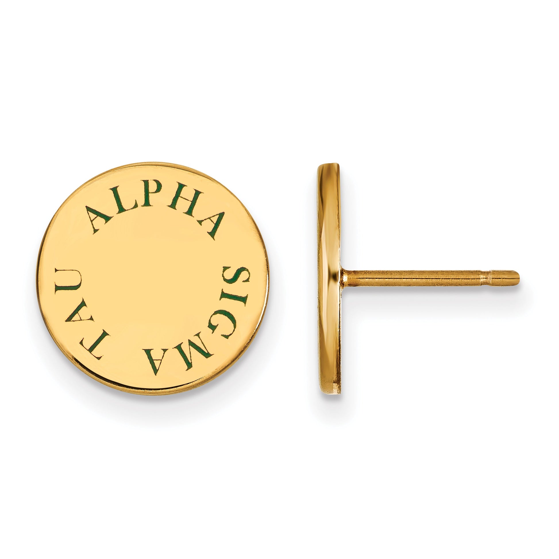 Show your pride with the SS/Gold Plated Sterling Silver Logoart Alpha Sigma Tau Sorority Text Enamel Post Earrings. Crafted from high-quality sterling silver with a durable gold plating, these earrings measure just 12 mm for a subtle, stylish look. The vibrant emerald enamel adds a pop of color, making them perfect for daily wear or special events. Designed with a secure post and push-back closure, these small button earrings stay comfortably in place. The Alpha Sigma Tau logo is laser-cut for a clean finish, offering a simple yet meaningful way to display your sorority spirit.