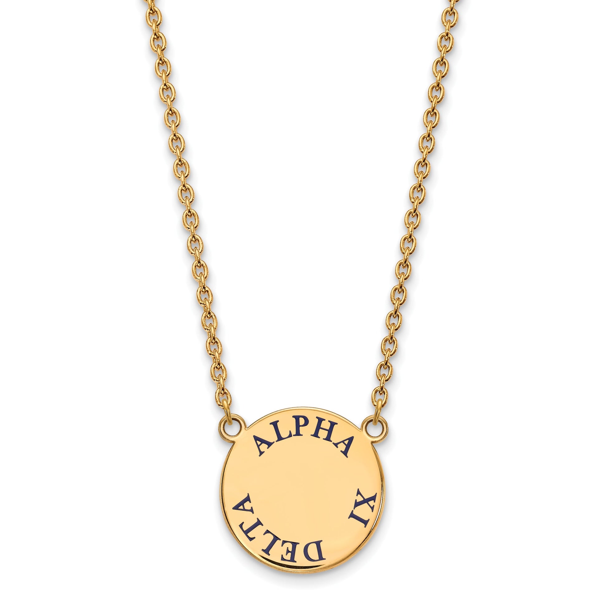 Make a statement with the Gold-Plated Logoart Alpha Xi Delta Sorority Necklace. Crafted from polished sterling silver, this 18-inch cable chain features a bold pendant that measures 19 mm square. The vibrant enamel highlights the Greek letters in rich blue and gold tone, showing off your sorority pride. Handcrafted with laser cutting, the pendant's design is sharp and durable. The lobster clasp keeps it secure. Whether you gift yourself or a fellow sister, the Gold-Plated Logoart Alpha Xi Delta Necklace is perfect for adding a touch of elegance and spirit to any look.