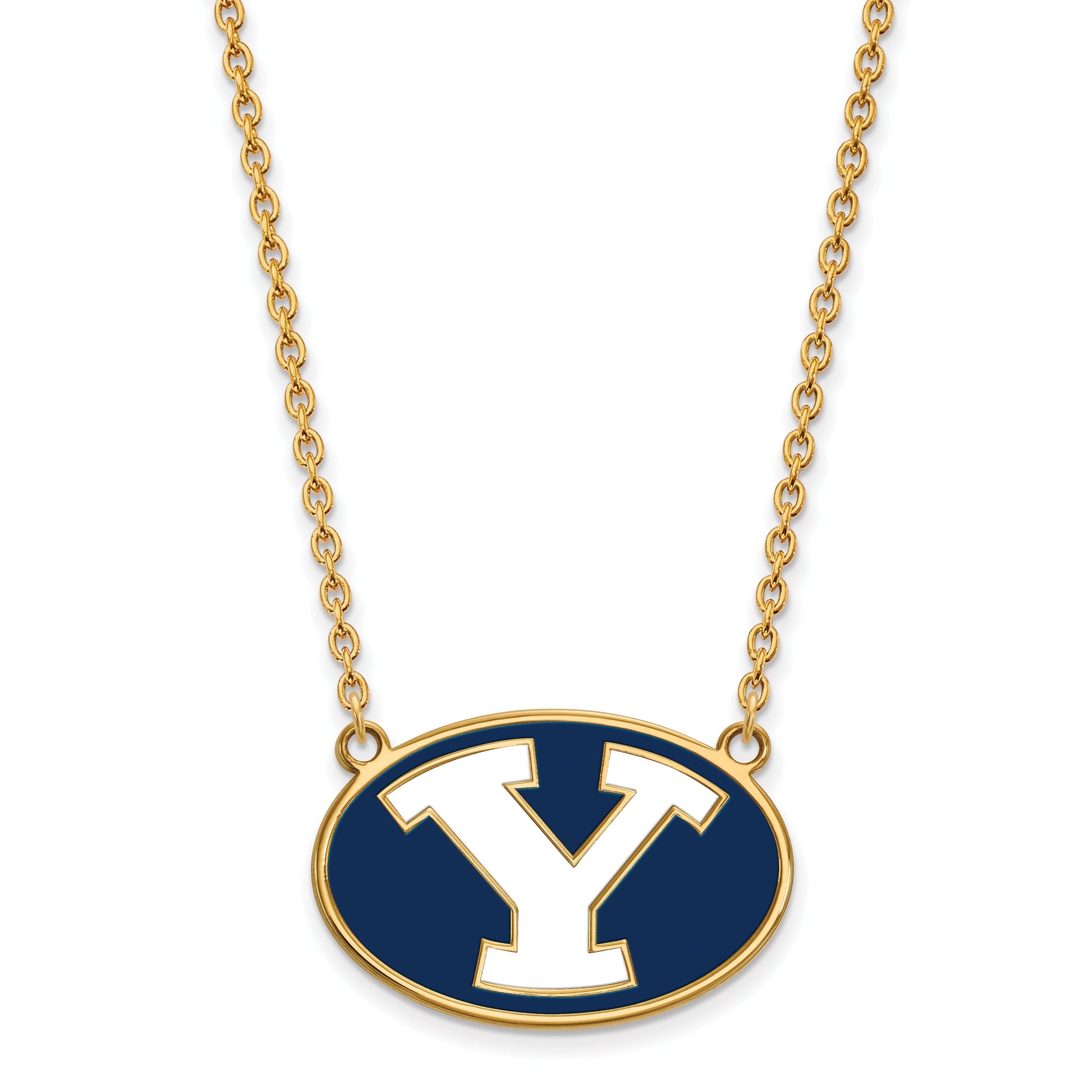 Show your school pride with the LogoArt Brigham Young University Letter Y Pendant. Made from polished sterling silver and coated with gold tone plating, this large pendant features the iconic BYU logo in bright enamel. The 18-inch cable chain offers a sleek look, with a sturdy lobster clasp for easy wear. Measuring 29 mm wide and 19 mm long, the pendant is perfect for everyday wear or special occasions. Licensed by NCAA and crafted with laser-cut precision, the LogoArt Brigham Young University Necklace is a bold way to celebrate your alma mater.
