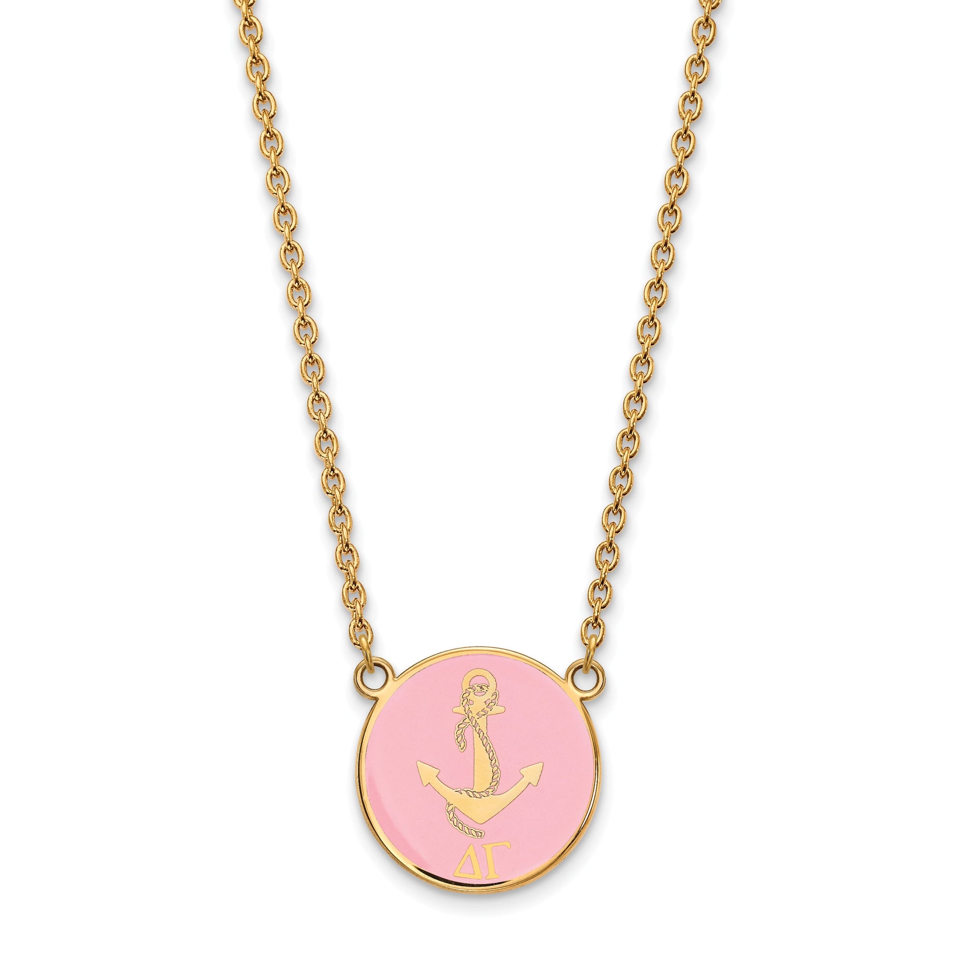 Celebrate your sorority pride with the LogoArt Delta Gamma Large Enamel Pendant on a sleek 18-inch gold-plated sterling silver chain. Crafted with precision, this necklace features a bold design enclosed in vibrant blue enamel that stands out. The pendant measures 19 mm, making it a striking piece, perfect for daily wear or special events. Made from polished sterling silver with a warm gold tone, it combines quality with style. The lobster clasp ensures a secure fit, letting you showcase your Delta Gamma spirit confidently. This LogoArt necklace truly captures your sorority pride in a chic, timeless way.