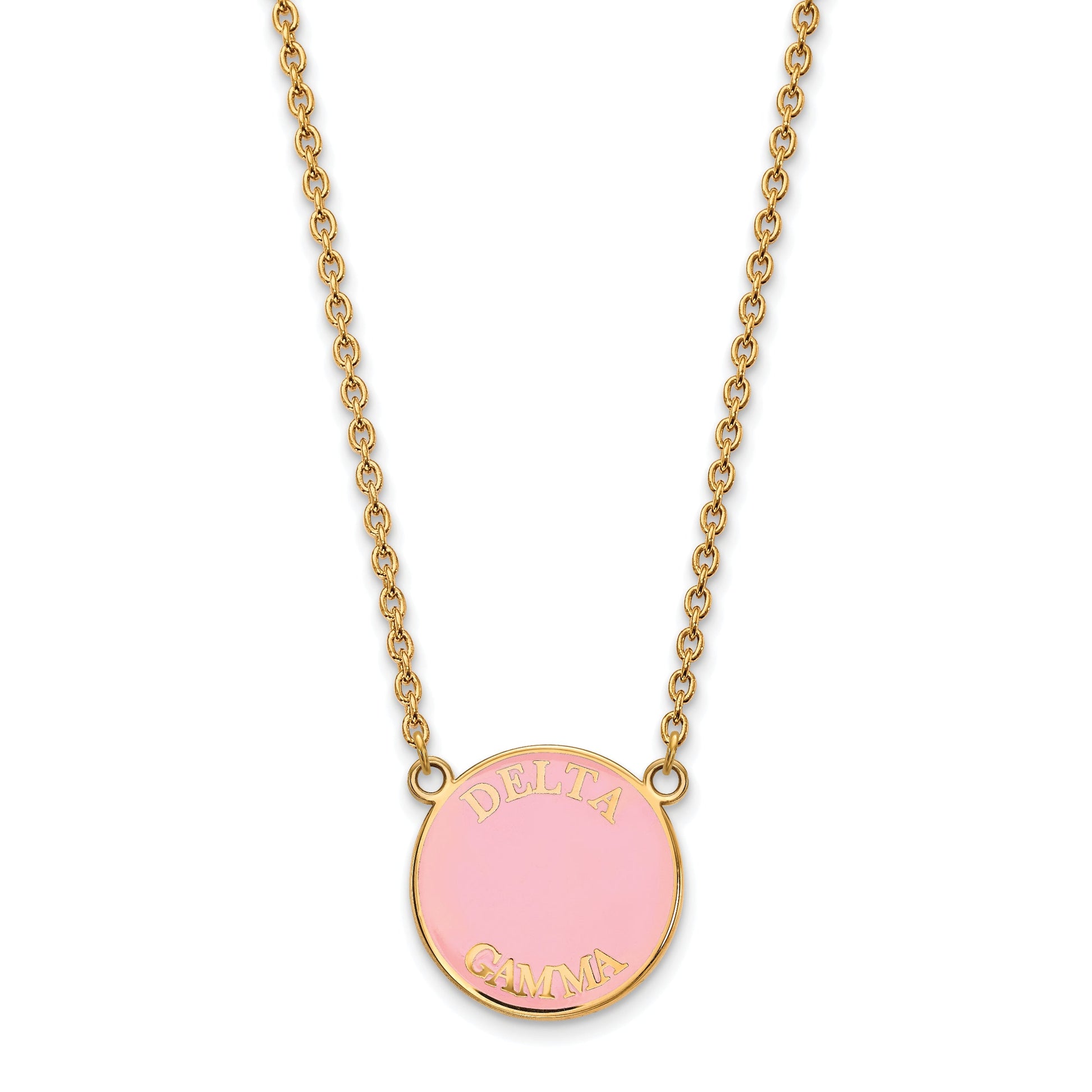 The Gold-Plated Sterling Silver Delta Gamma Pendant Necklace is a shining symbol of sorority pride. Crafted from high-quality sterling silver with a warm gold-plated finish, this 18-inch cable chain necklace offers a bold statement piece. The large enamel pendant features the Delta Gamma Greek letters in bright blue, framed by side stone mountings that add a touch of sparkle. With its laser-cut design and durable lobster clasp, this jewelry piece fits comfortably and lasts long. Perfect for showing your sorority spirit, the Delta Gamma Gold-Plated Sterling Silver Necklace blends style with meaning.