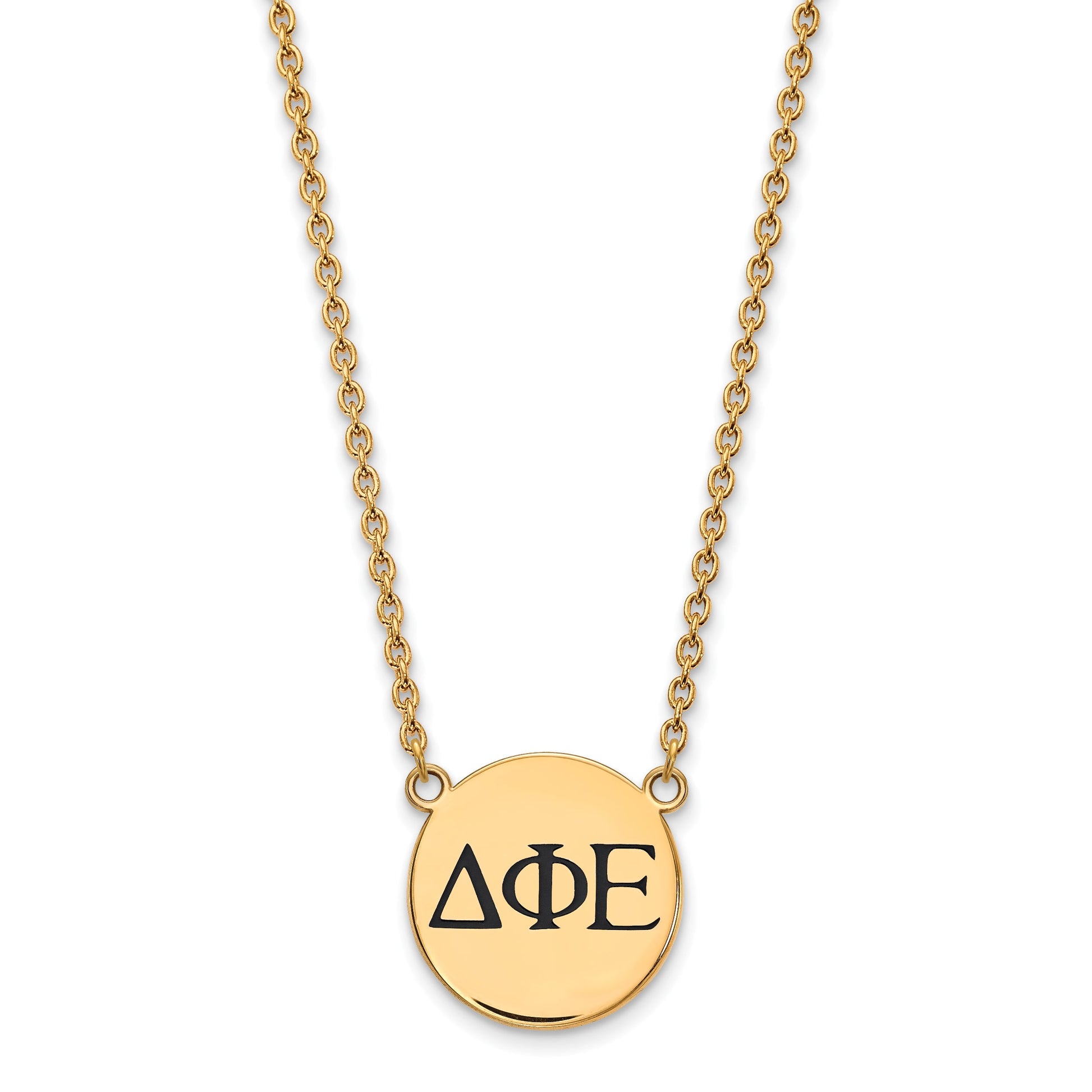 Elevate your style with the Delta Phi Epsilon Greek Letters Pendant Necklace. Crafted from genuine sterling silver and finished with bright gold plating, this necklace delivers a sleek, polished look. The large black enamel Delta Phi Epsilon logo stands out, making it a bold statement piece. Measuring 18 inches, the cable chain secures with a sturdy lobster clasp for easy wear. Its laser-cut design ensures sharp details and durability. Whether for formal events or everyday wear, the Delta Phi Epsilon Large Black Enamel Pendant Necklace is a perfect way to show your sorority pride in style.