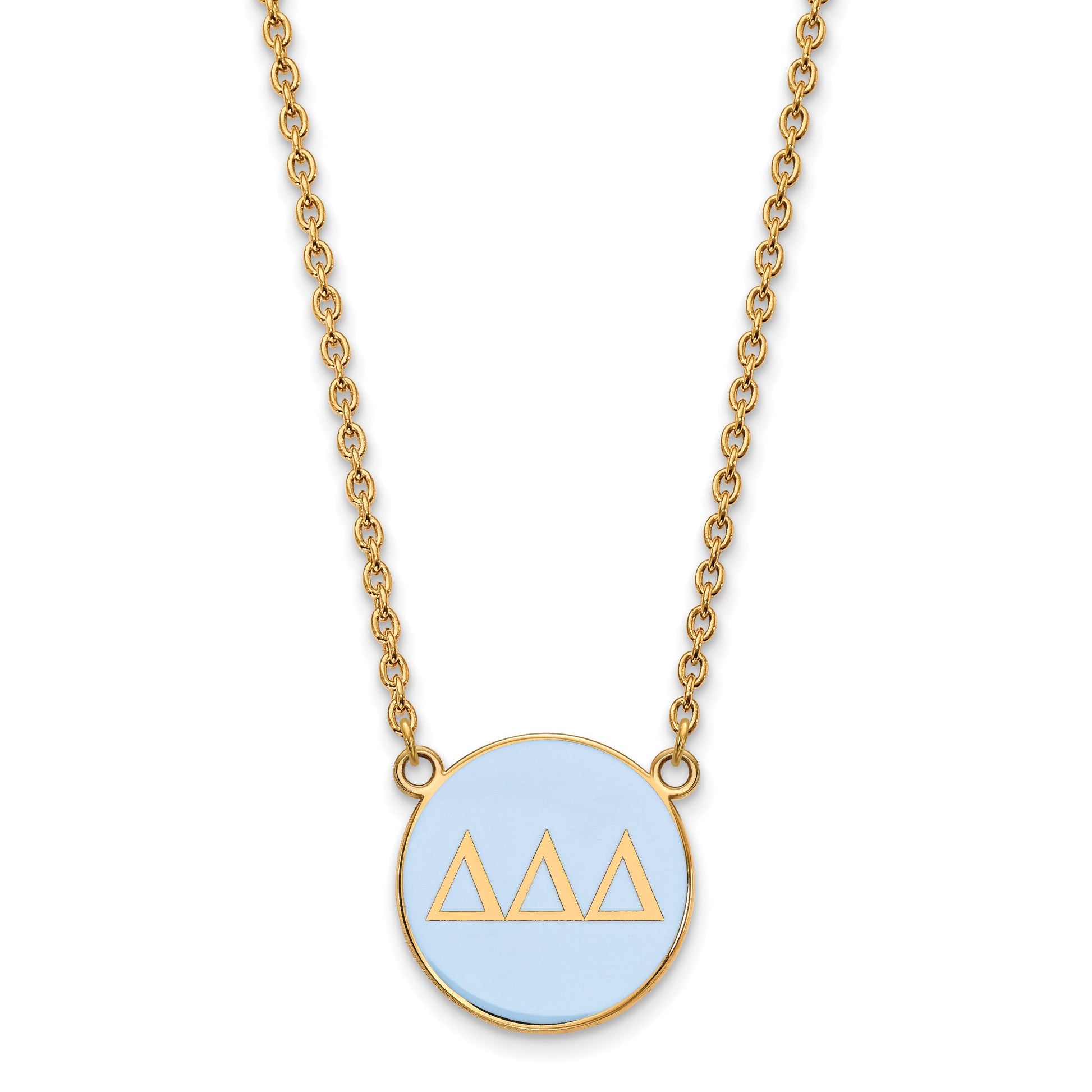 The LogoArt Delta Sorority Greek Letters Necklace is a bold and stylish piece representing your sisterhood. Crafted from polished 925 sterling silver, it features a large, colorful enamel pendant in a vibrant cerulean hue. The gold plating adds a stunning shine that complements the distinctive Greek letters. The necklace measures 18 inches, perfect for everyday wear, and is finished with a sturdy lobster clasp. This piece is laser-cut for clean lines and high-quality detail, making it a meaningful addition to your jewelry collection. Show your pride with the LogoArt Delta Sorority Necklace, a true symbol of your bond.