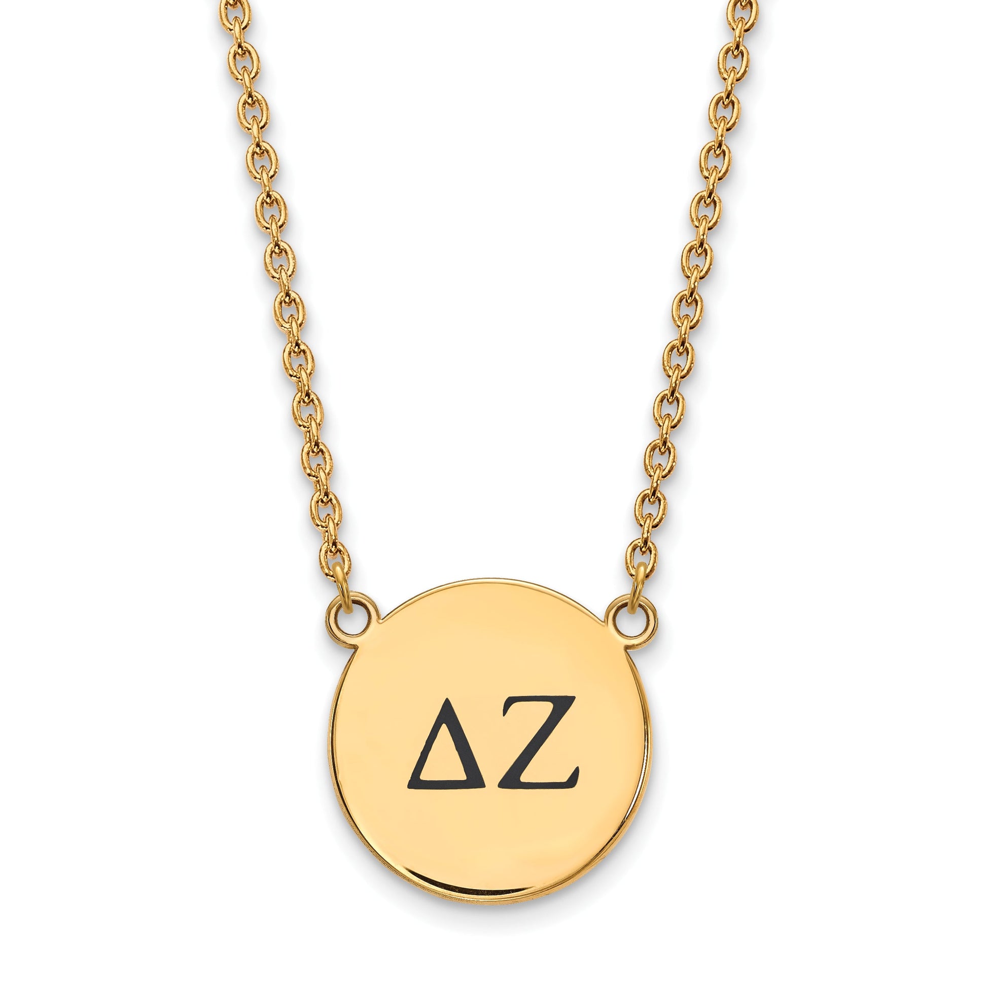 Discover the beauty of the Gold-Plated LogoArt Delta Zeta Sorority Greek Letters Large Black Enamel Pendant Necklace. Crafted from polished 925 sterling silver, this 18-inch cable chain offers a sleek look that hangs comfortably. The standout feature is the large black enamel sorority logo, detailed with laser cutting for precision. Gold plating adds a warm shine, while subtle green accents enhance its charm. Perfect for showing pride or gifting a loved one, the Delta Zeta diploma pendant combines style and meaning. This necklace makes a bold statement and is a must-have for any Delta Zeta member.