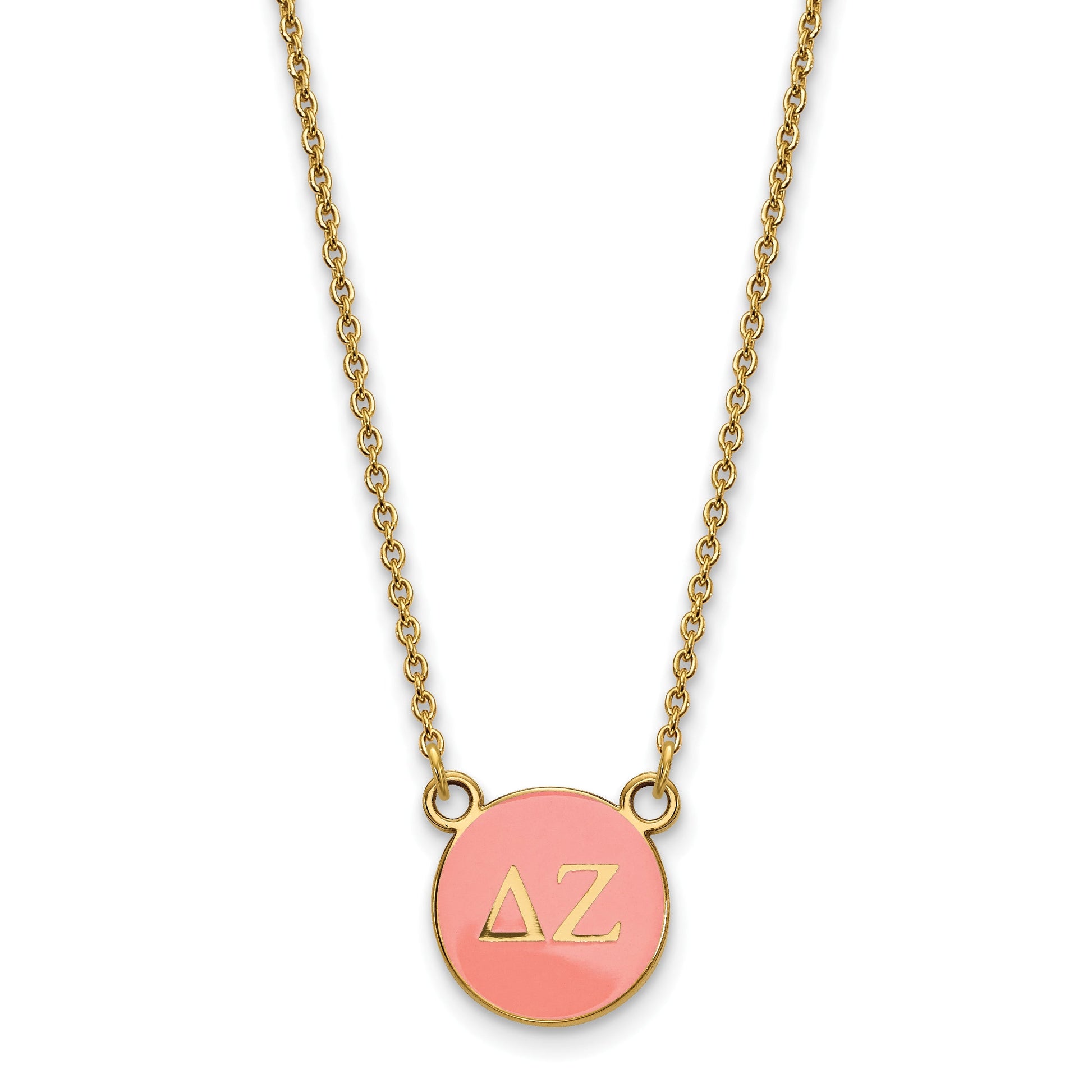 Celebrate your pride with the Gold-Plated Logoart Delta Zeta Sorority Necklace. Crafted from sterling silver with a polished finish, this 18-inch cable chain offers a sleek look that pairs well with any outfit. The small charm features vibrant enamel in pink, green, and gold, displaying the iconic Delta Zeta Greek letters. With laser-cut details and a secure lobster clasp, this jewelry piece is both stylish and durable. Perfect for showing your sorority spirit, the Delta Zeta Gold-Plated Silver Necklace makes a meaningful gift or personal keepsake that lasts.
