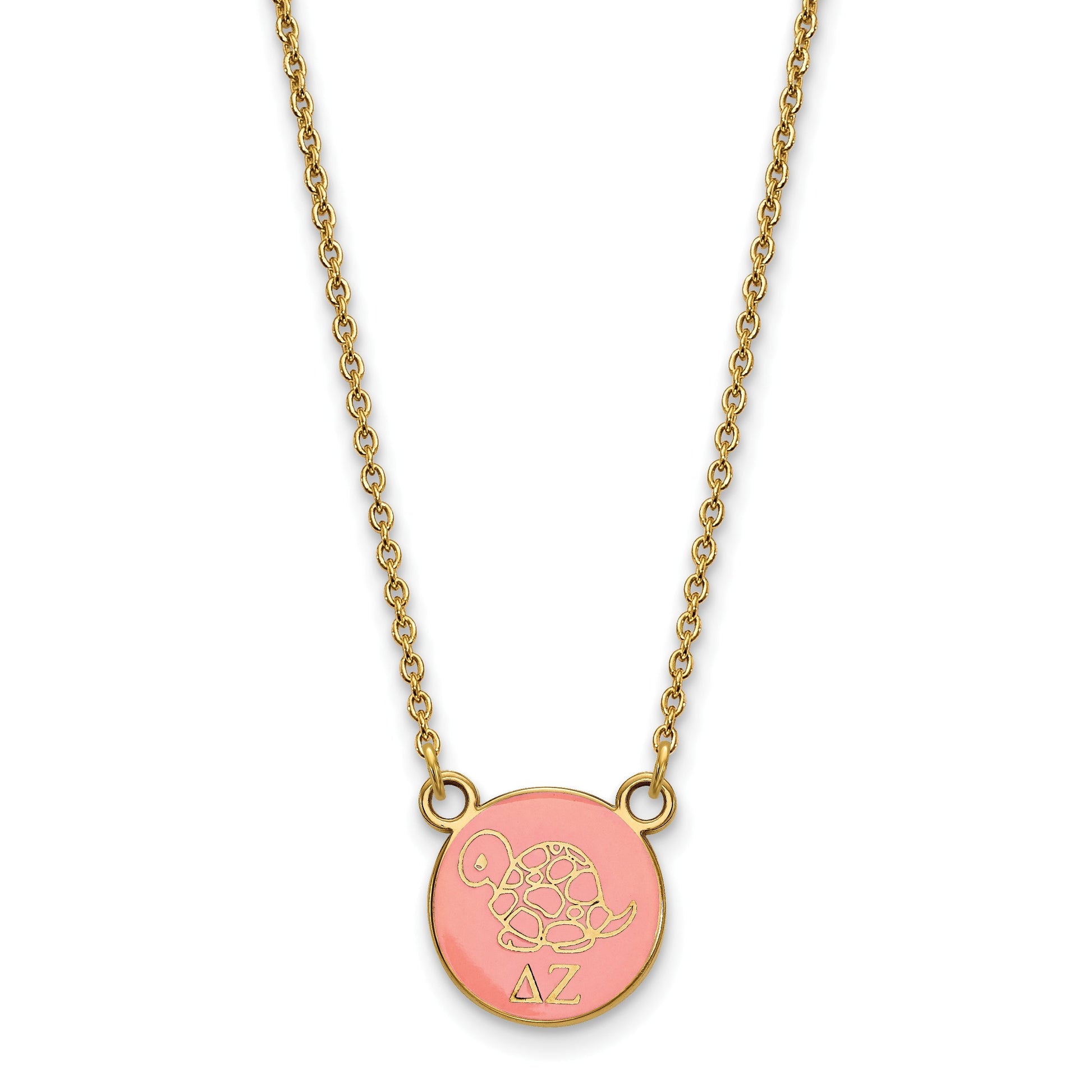 The Gold-Plated Sterling Silver Logoart Delta Zeta Sorority Symbol Necklace is a charming piece for sorority sisters. Crafted from high-quality sterling silver, it shines with a polished finish. This 18-inch cable chain holds a small, colorful enamel pendant featuring the Delta Zeta logo in pink and green accents, making it eye-catching yet subtle. The pendant measures 12 mm, adding just the right touch of style without being heavy. Perfect for daily wear, this necklace offers a sleek look that shows your sorority pride. The Lobster clasp makes it easy to put on and take off.