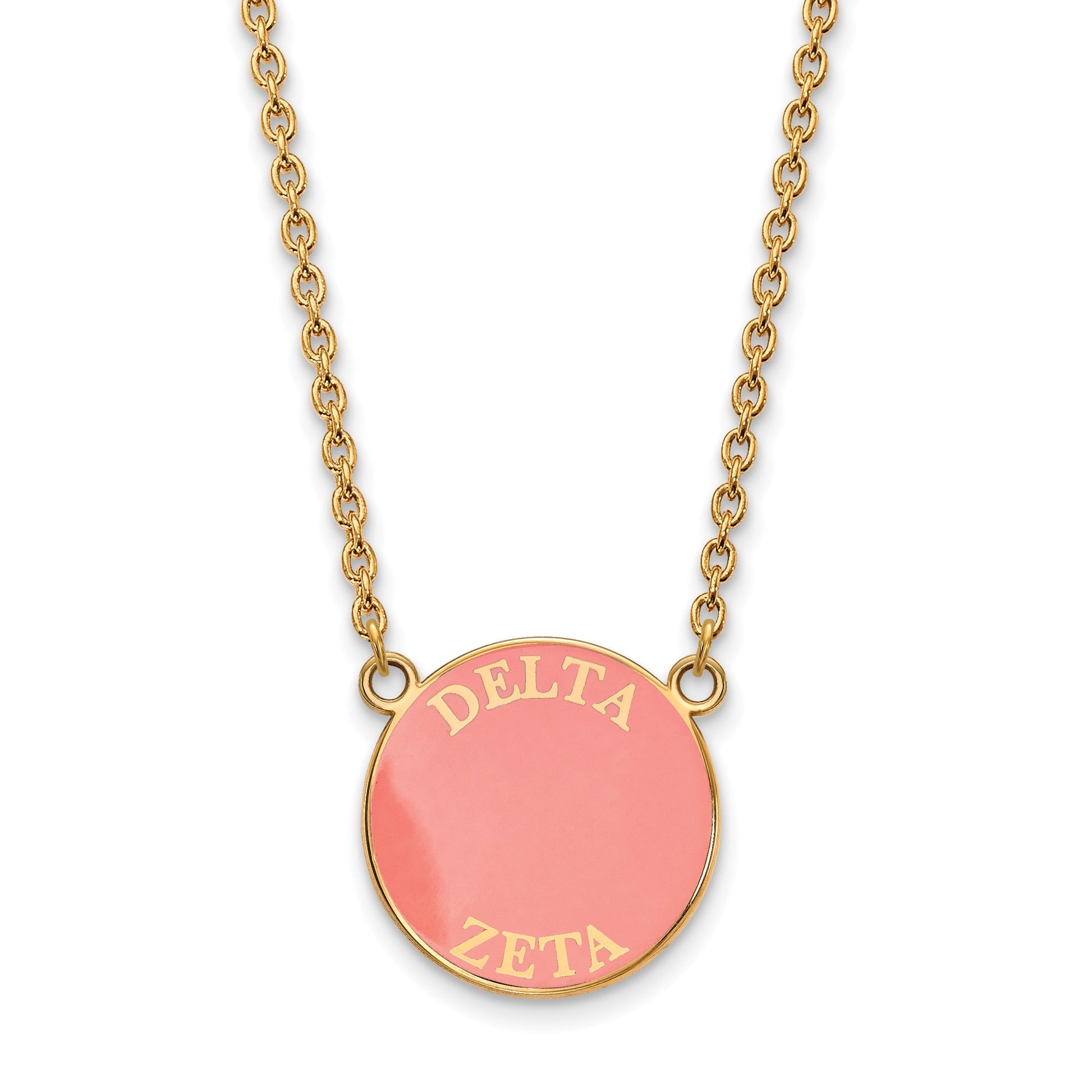 The Gold-Plated Sterling Silver Delta Zeta Pendant Necklace makes a bold statement. Crafted from 925 sterling silver with a shiny gold finish, it features a colorful enamel logo charm that shows off your sorority pride. The large, eye-catching design is 19 mm wide and 19 mm long, perfect for showing off your identity. The necklace is 18 inches long with a sturdy lobster clasp for secure wear. With a mix of pink and green accents, this necklace adds a pop of color to any outfit. The LogoArt Delta Zeta pendant is a stylish way to display your sorority spirit.