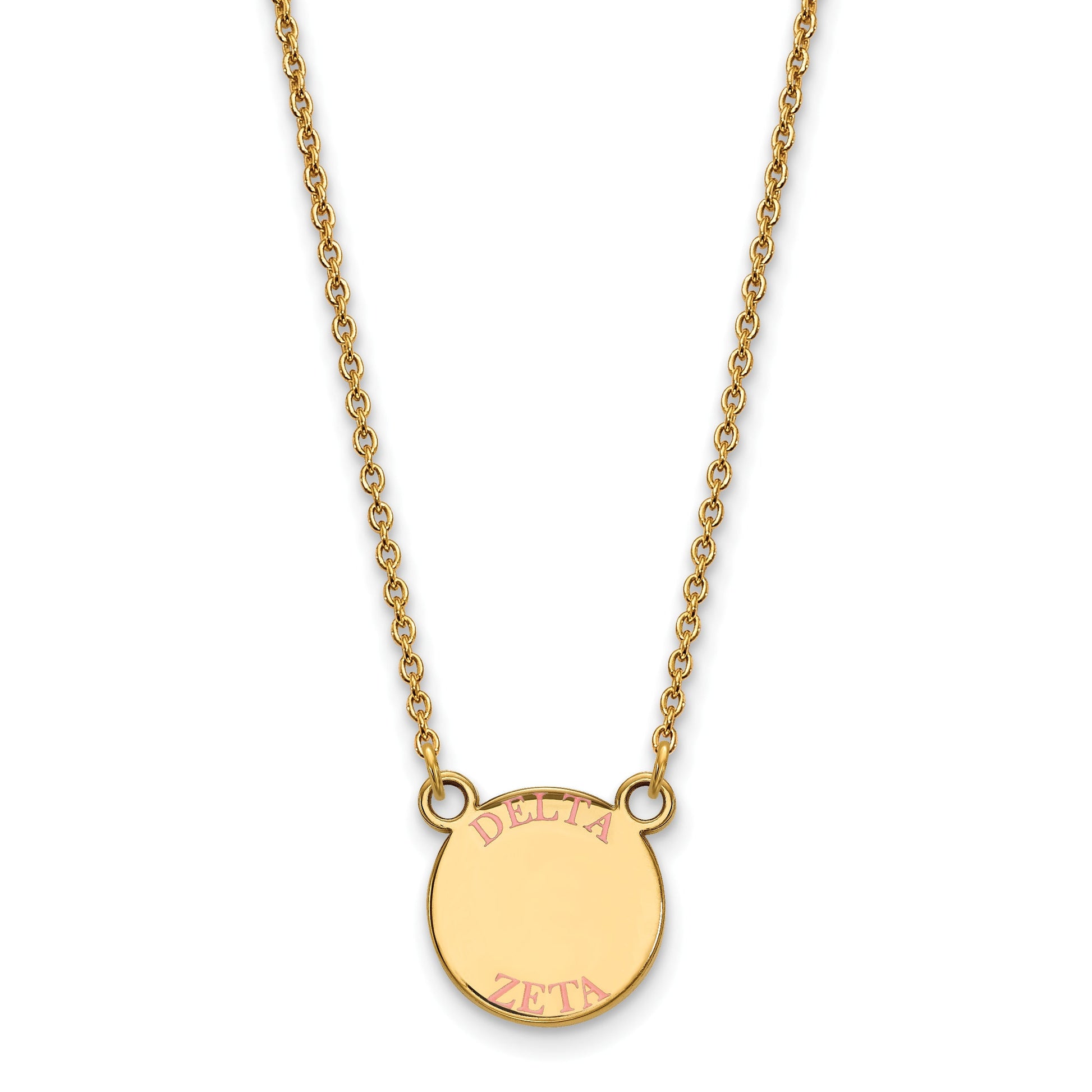 Introducing the Logoart Delta Zeta Sorority Necklace, crafted from high-quality sterling silver and finished with a shiny gold plate. This 18-inch chain features a small, eye-catching charm decorated with vibrant pink and green enamel accents, symbolizing Delta Zeta. The laser-cut pendant measures 12mm and is securely fastened with a lobster clasp for easy wear. Perfect for showing pride in your sorority, the Logoart Delta Zeta necklace adds a pop of color and style to any outfit while letting you carry your sisterhood close to your heart.
