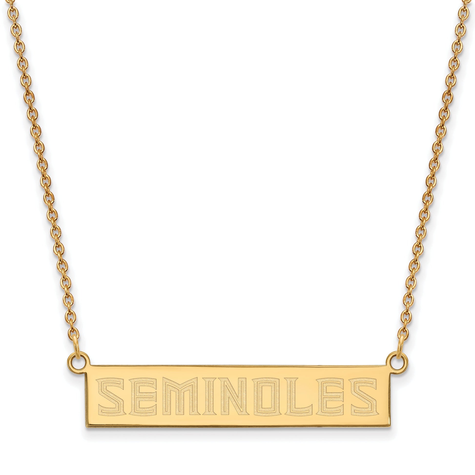 Show your school pride with the Logoart Florida State University Seminoles Small Bar Necklace. Crafted from high-quality 925 sterling silver, this 18-inch cable chain necklace is finished with a bright gold plating that adds a stylish touch. The pendant features a sleek logo design, symbolizing your love for the Seminoles. Its compact size makes it perfect for everyday wear, and the laser-cut process ensures durability and a clean look. Logoart Florida State University Seminoles Small Bar Necklace is a great way to show off your school spirit with a simple, stunning piece.