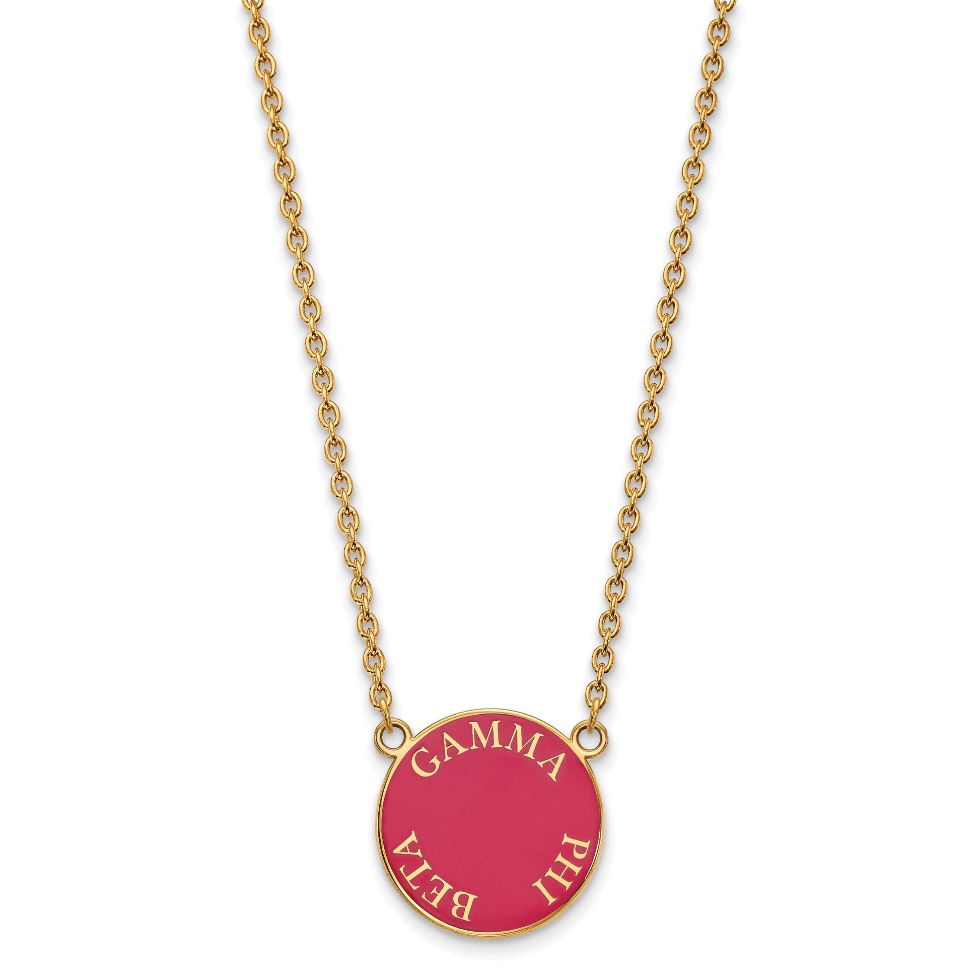 Introducing the Gold-Plated Logoart Gamma Phi Beta Sorority Necklace, a striking piece that blends style with pride. Made of durable sterling silver with a bright gold finish, this 18-inch chain features a bold, laser-cut pendant showcasing the sorority's logo in vibrant enamel, highlighted with hot pink and dark brown accents. The pendant measures 19 mm in size, making it a noticeable statement piece. Its lobster clasp ensures a secure fit, while the polished look adds a touch of elegance. Perfect for any Gamma Phi Beta member, the Gold-Plated Logoart Gamma Phi Beta Sorority Necklace combines quality craftsmanship with a vibrant design.