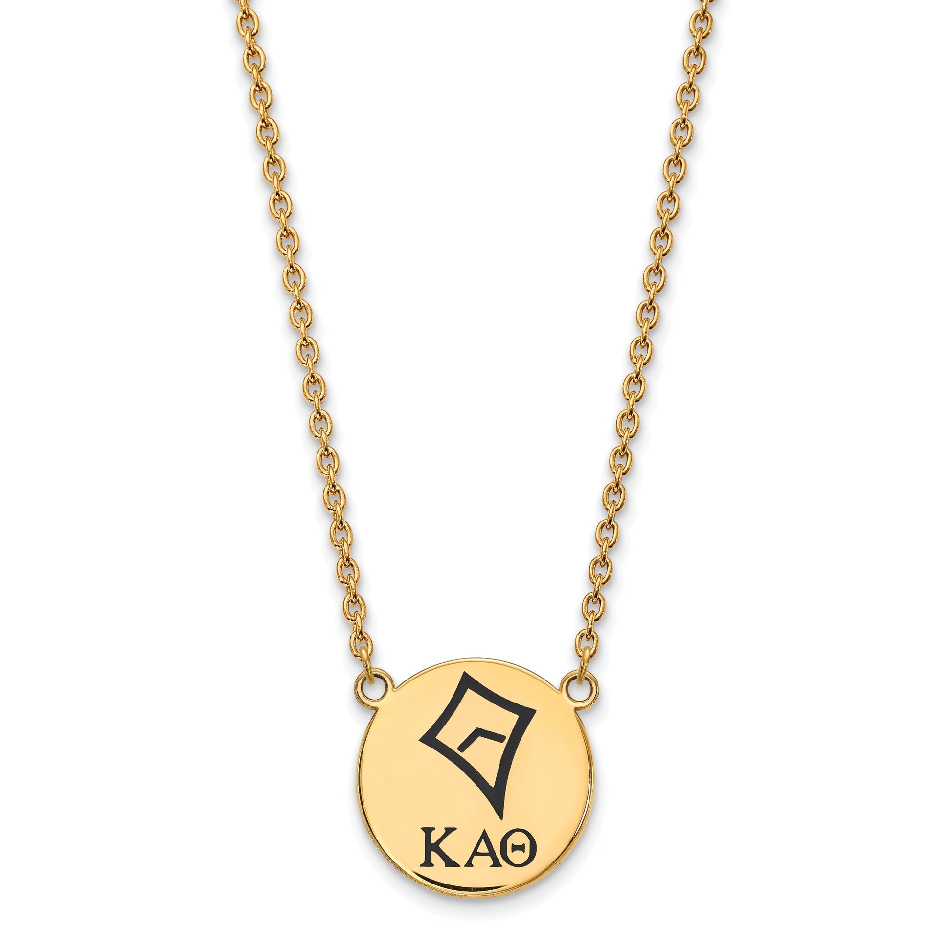 The Kappa Alpha Theta Large Enamel Pendant Necklace by LogoArt is a bold piece that shows off your sorority pride. Made from shiny sterling silver with a warm gold plating, this 18-inch chain features a large, colorful Theta logo. The pendant measures 19 mm and is crafted with laser cut precision and charming enamel accents in gold and black. Its lobster clasp keeps it secure, making it perfect for daily wear or special events. Show your sisterhood with this eye-catching necklace from LogoArt, a trusted name in licensed Greek jewelry.