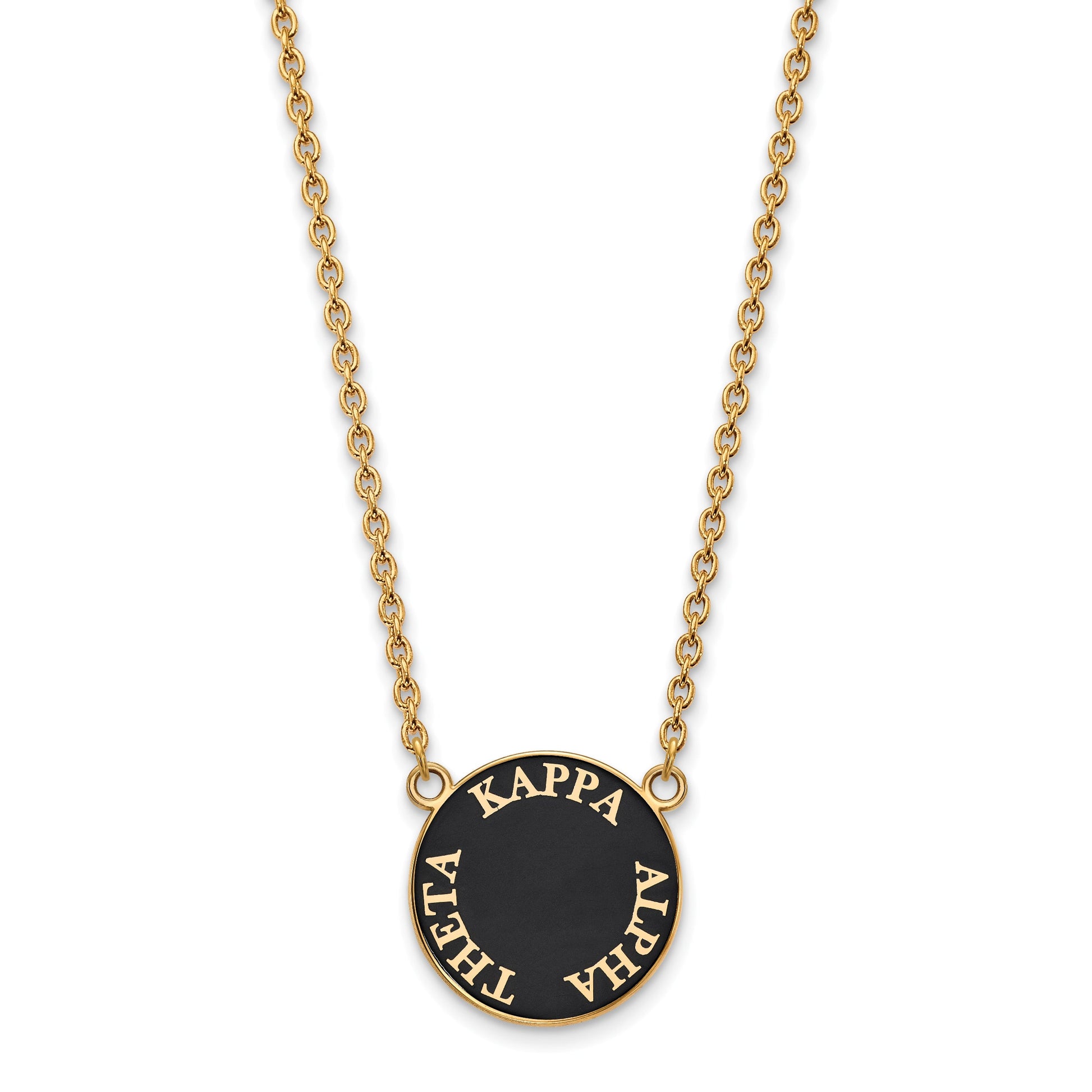 The Kappa Alpha Theta Large Enamel Pendant Necklace is a stylish piece for sorority members. Made from high-quality sterling silver, it features a shiny gold-plated finish, adding a rich look. The 18-inch cable chain is sturdy and easy to wear. The bold pendant displays the Kappa Alpha Theta logo with vibrant enamel in gold, black, and bright colors. Laser cut for precision, this necklace is a perfect way to show your pride. Whether for daily wear or special occasions, the Kappa Alpha Theta Necklace makes a great gift for sisters.