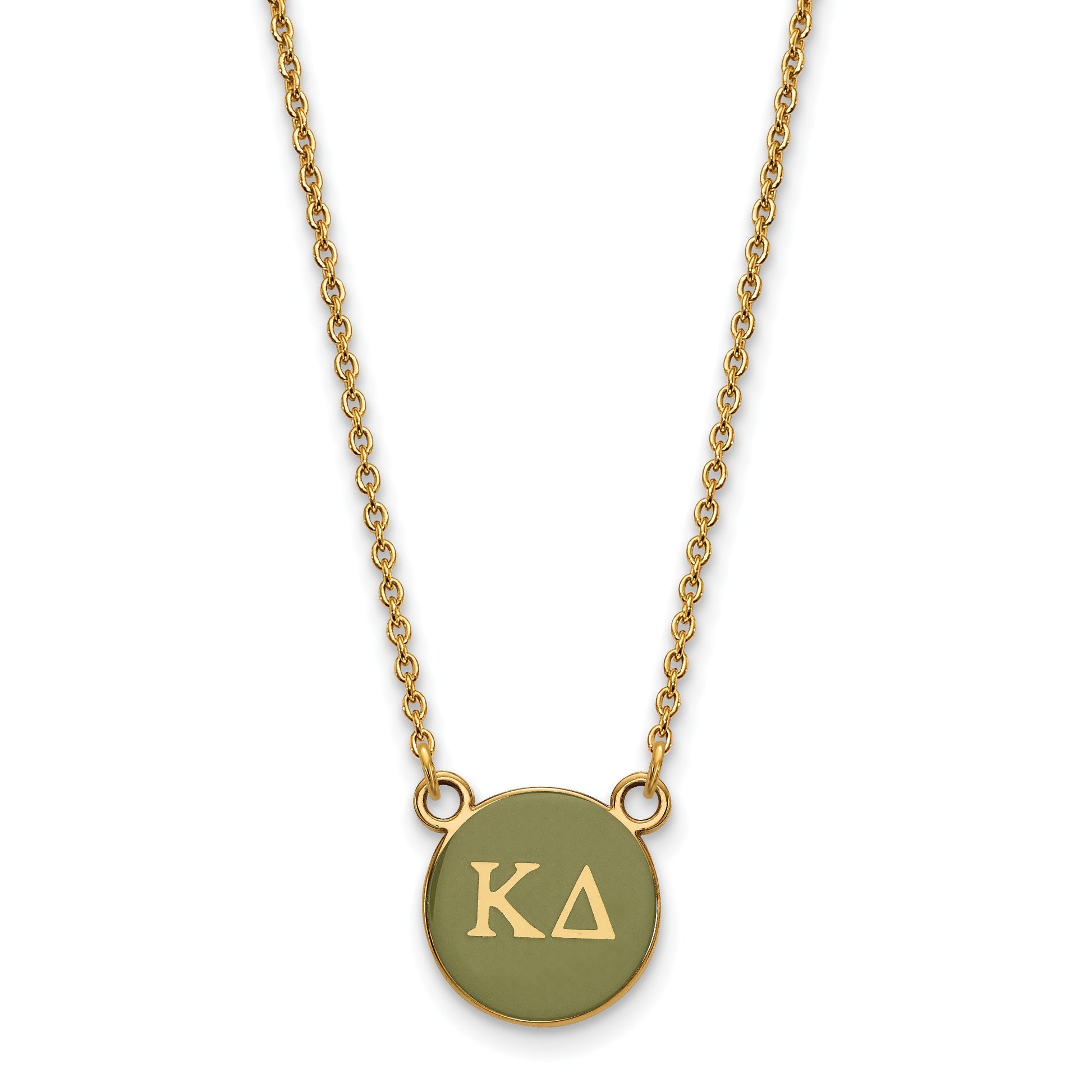 Show your sisterhood pride with the LogoArt Kappa Delta Greek Letters Pendant Necklace. Made from polished sterling silver and coated in rich gold plating, this small enamel charm features the iconic Kappa Delta Greek letters filled with stylish olive green. The 18-inch cable chain provides a comfortable fit, while the lobster clasp ensures secure wear. Crafted with laser-cut precision, this jewelry piece combines elegance and strength. Perfect for everyday wear or special sorority events, the LogoArt Kappa Delta Necklace highlights your pride and style effortlessly.