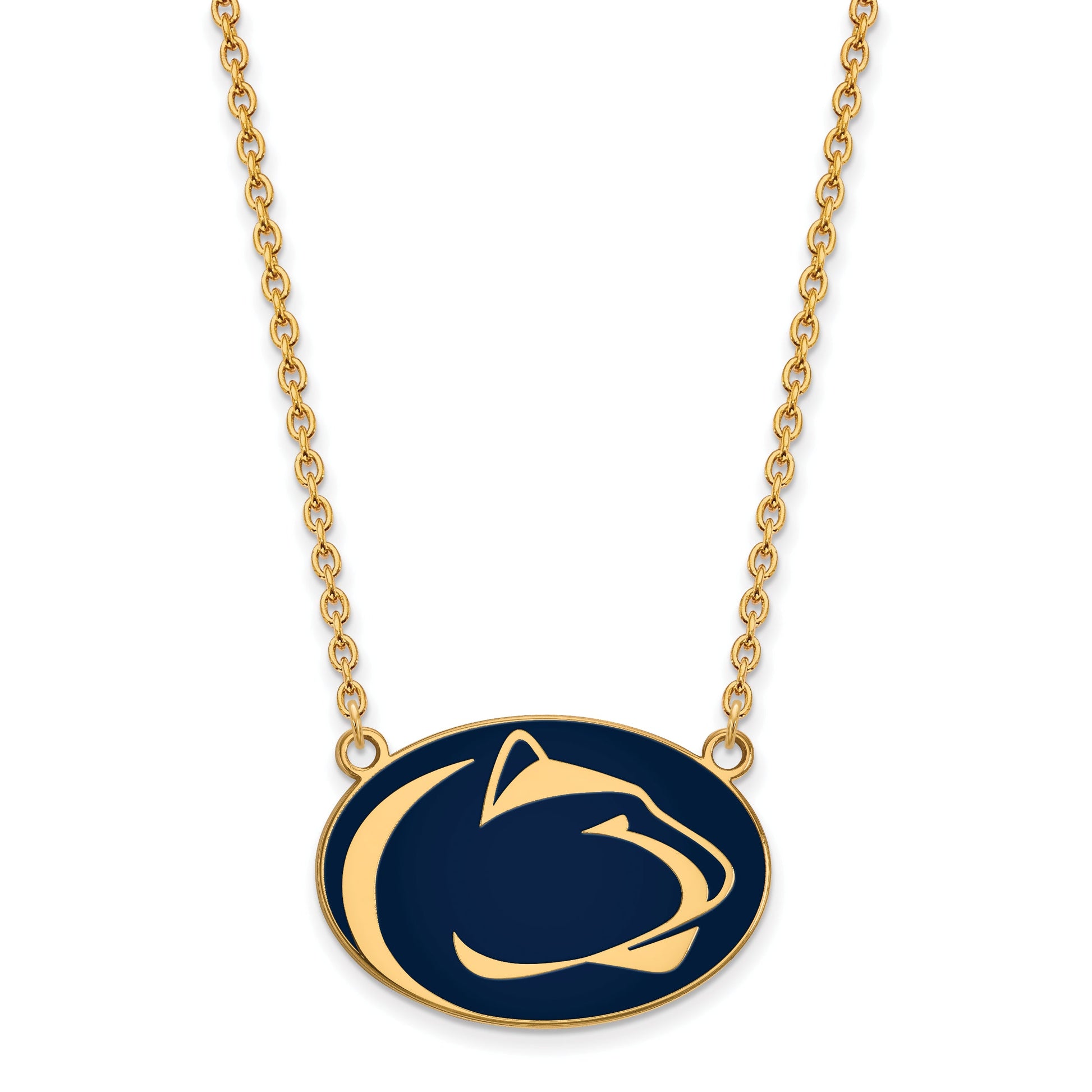 Show off your pride with the LogoArt Penn State University Lion pendant. Made from high-quality sterling silver, it features a bold gold-plated finish that shines. The large enameled lion charm measures 28 mm wide and 21 mm tall, making it a true statement piece. The pendant hangs on a sturdy 18-inch cable chain, perfect for everyday wear. Licensed by NCAA, this necklace celebrates Penn State with style and durability. LogoArt Penn State University Lion large pendant truly highlights your school spirit in a sleek, eye-catching design.