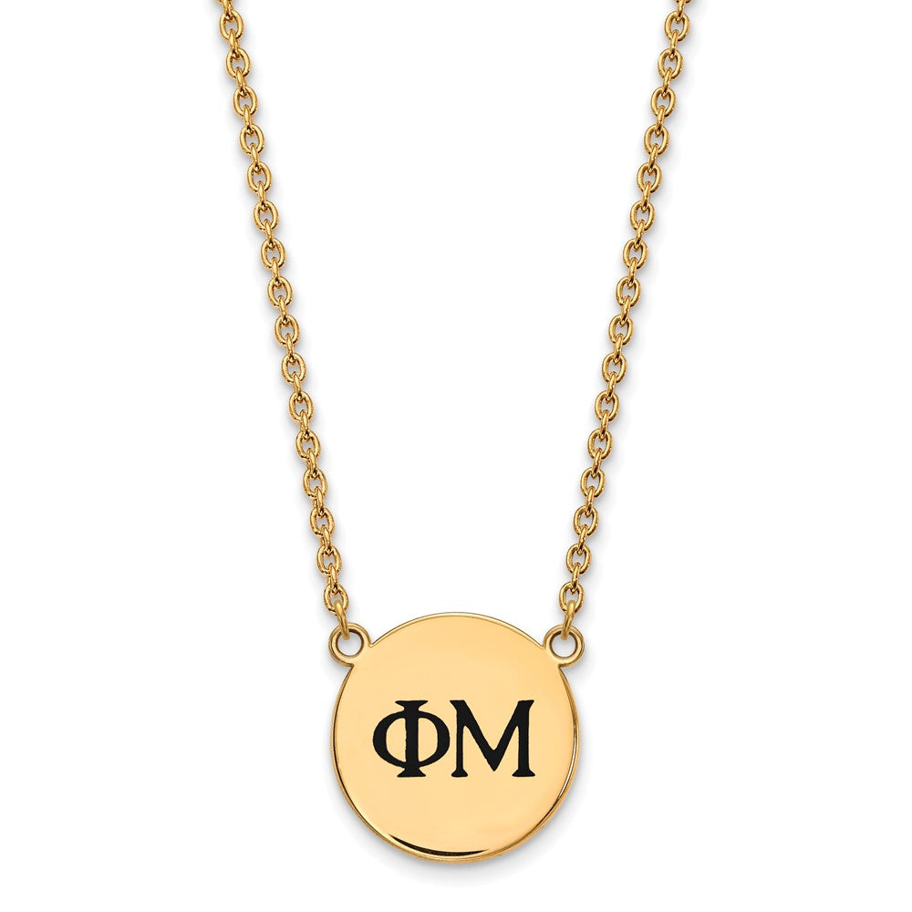 The Gold-Plated Logoart Phi Mu Greek Letters Necklace is a bold piece that celebrates your sisterhood. Made from polished sterling silver with a rich gold plating, it features a striking black enamel charm that displays the Phi Mu sorority Greek letters. The necklace measures 18 inches long, fitting comfortably around your neck, and boasts a sturdy lobster clasp for easy wear. Its laser-cut design adds precision, while the sizable charm makes a strong statement. Perfect for any Phi Mu member, the Gold-Plated Logoart Phi Mu Greek Letters Necklace is a lovely way to show pride and keep campus memories close.