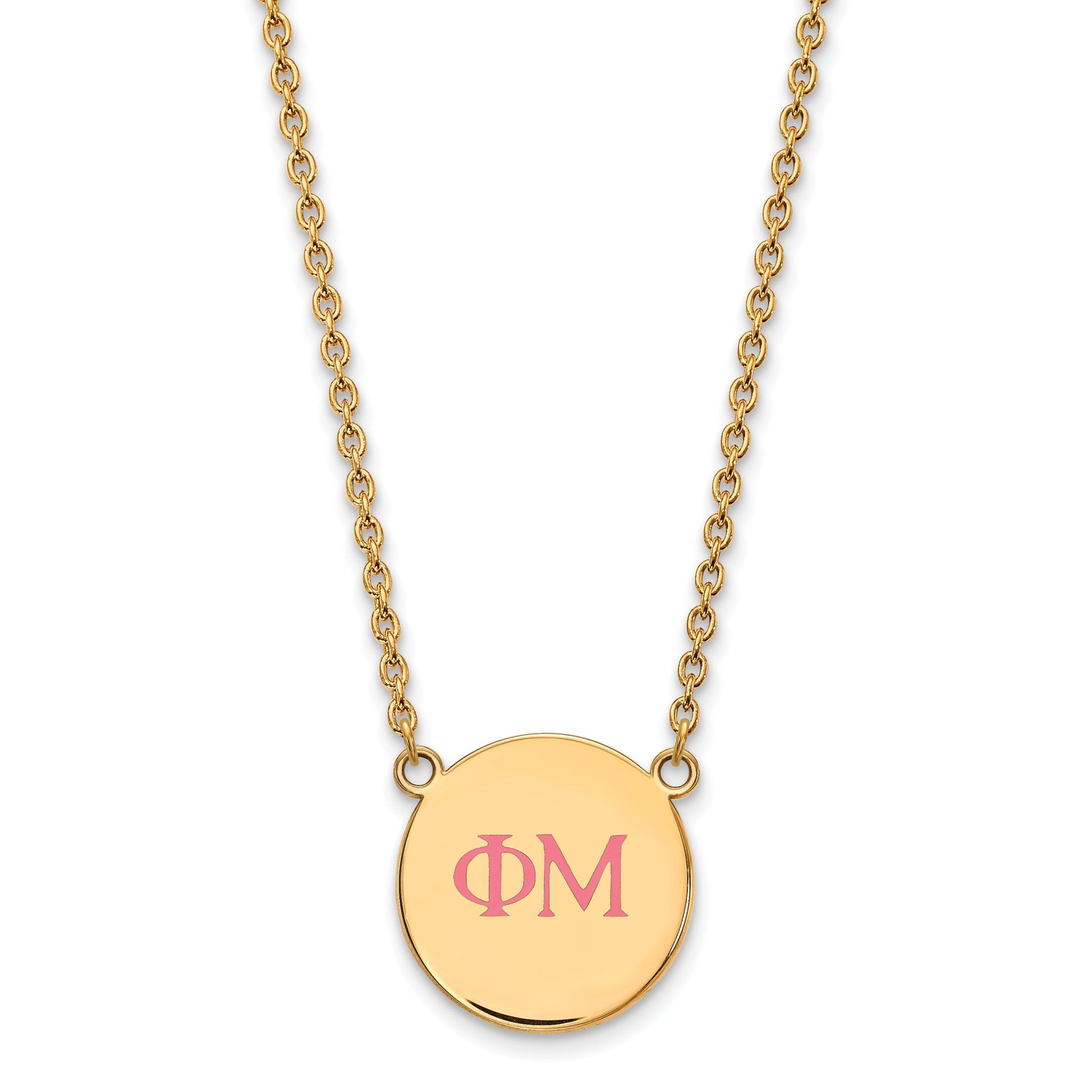 Show your pride with the LogoArt Phi Mu Greek Letters Necklace. Crafted from sterling silver, it’s beautifully polished and layered in gold tone for a warm, eye-catching look. The large enamel pendant measures 19 mm and features the iconic Phi Mu logo in vibrant rose and white hues, making it stand out. An 18-inch cable chain with a lobster clasp keeps it secure and easy to wear. Whether you wear it daily or on special occasions, the Phi Mu LogoArt necklace adds a personal touch to your style.