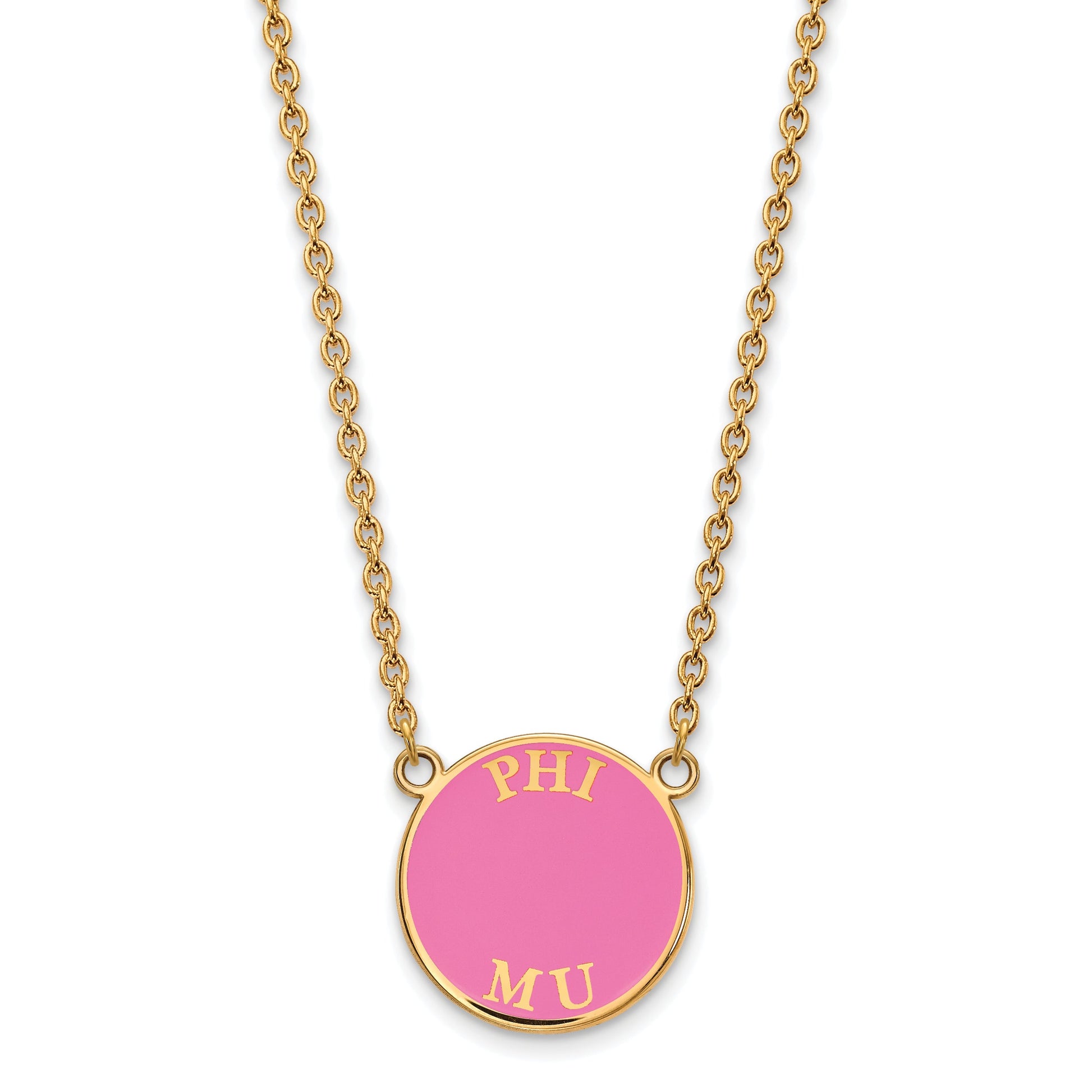 The Phi Mu LogoArt pendant necklace makes a bold statement. Crafted from sterling silver with a bright gold-plated finish, it features a large, colorful enamel charm that displays the Phi Mu sorority logo. The necklace measures 18 inches long with a sturdy cable chain and a reliable lobster clasp. Its polished look is both chic and durable, perfect for showing off your pride. Highlighted with rose and white enamel accents, this piece offers a vibrant touch to any outfit. The Phi Mu LogoArt necklace is a fine way to celebrate your sorority spirit with style.