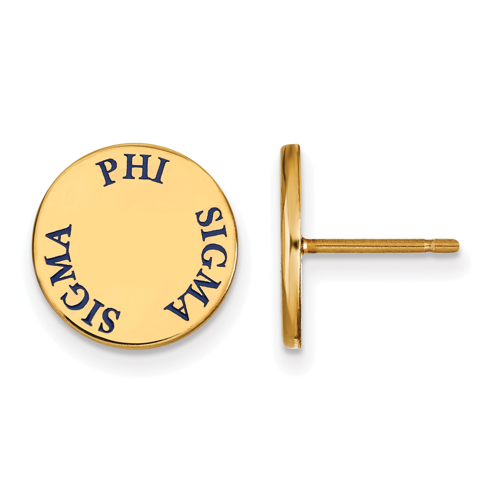 Show off your pride with the SS/Gold Plated Sterling Silver Phi Sigma Sigma Earrings. These earrings are crafted from high-quality 925 sterling silver and coated in a bright gold tone. Each pair measures 12 mm wide, making them perfect for everyday wear or special events. The bold Phi Sigma Sigma logo is highlighted with eye-catching enamel color, adding a pop of style. Lightweight and durable, these earrings comfortably sit on your ears, making them a must-have for any sorority sister. Carry your love for Phi Sigma Sigma everywhere with the SS/Gold Plated Sterling Silver Earrings.