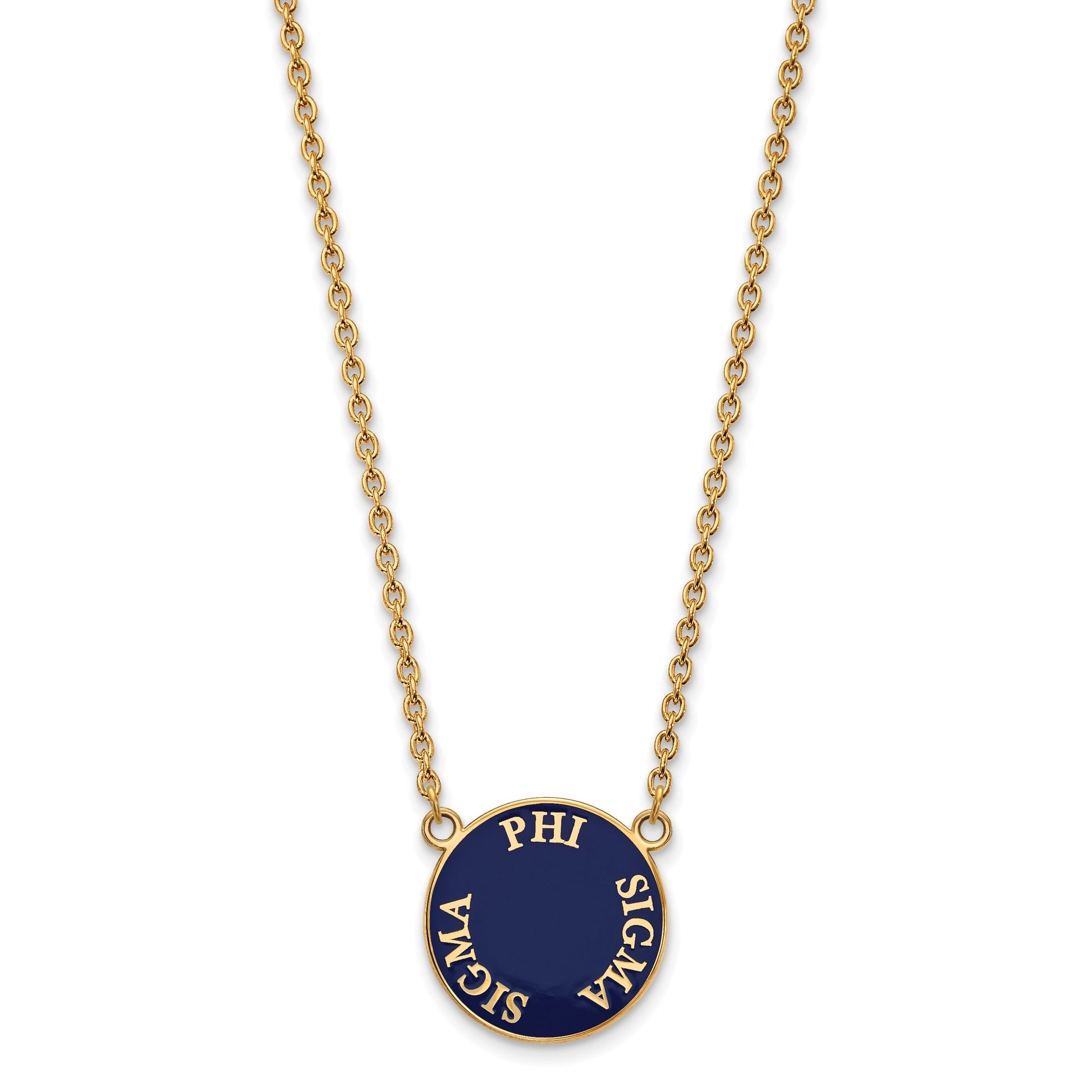 Show your pride with the Phi Sigma Sigma Gold-Plated Logoart pendant. Crafted from sterling silver and finished with a bright gold tone, this bold piece features the sorority's logo in vibrant enamel, making it stand out. The large design measures about 19 mm, perfect for making a statement. Paired with an 18-inch chain, this pendant is ideal for daily wear or special occasions. The high-quality materials ensure durability and shine. Celebrate your sisterhood with the Phi Sigma Sigma Logoart pendant, a stylish piece that shows off your pride in premium style.