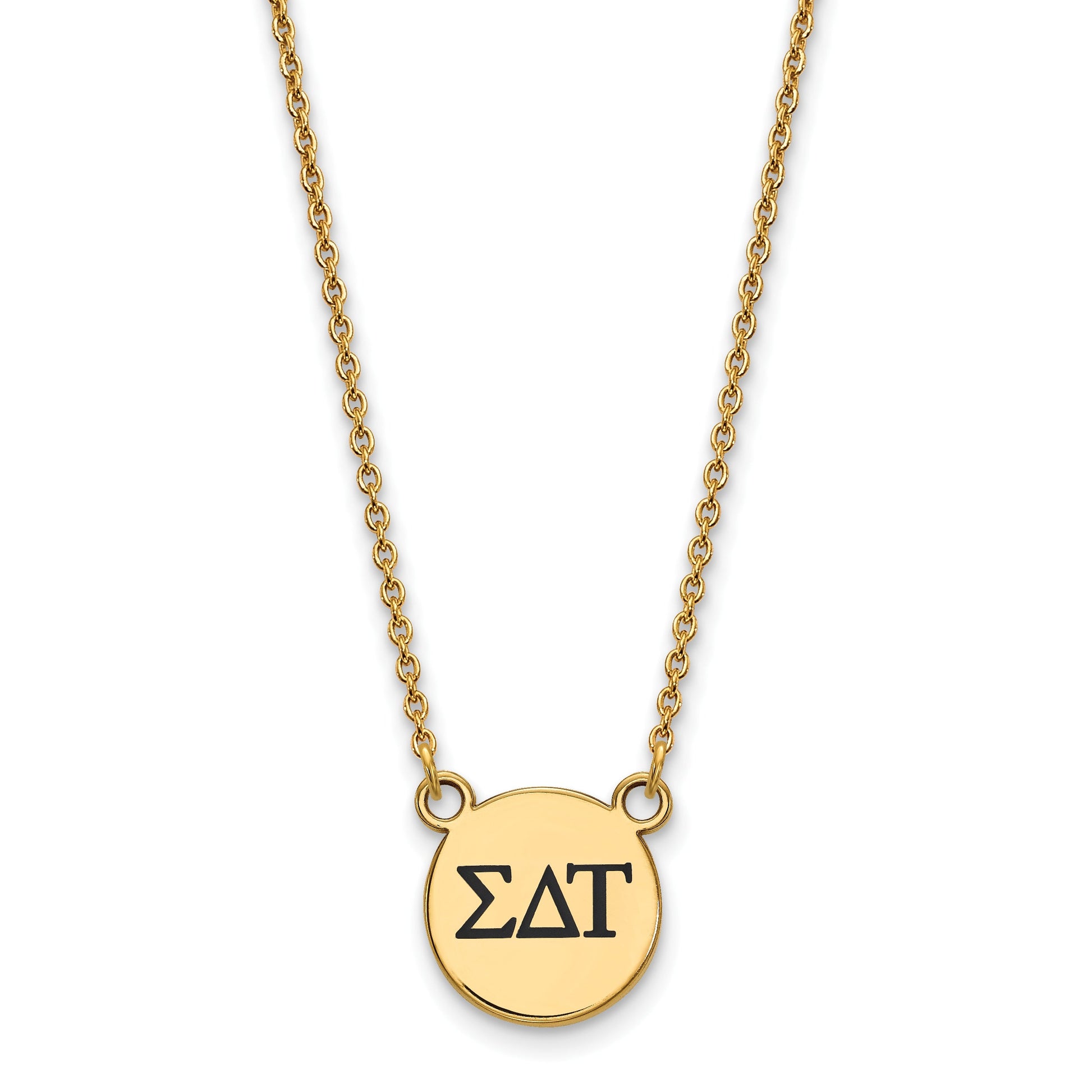 Introducing the Sigma Delta Tau Gold-Plated Sterling Silver Necklace, a chic piece that shows your sorority pride. Crafted from high-quality 925 sterling silver and finished with a shiny gold tone, this necklace features a small black enamel logo charm. It measures 18 inches long with a sturdy lobster clasp for easy wear. The pendant, 12 mm in size, beautifully displays the Sigma Delta Tau Greek letters, accented with elegant black and blue enamel. Perfect for everyday wear, the Sigma Delta Tau necklace adds a subtle touch of class to any outfit, making it a must-have for proud sorority members.