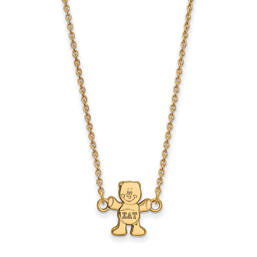 Introducing the Gold-Plated Logoart Sigma Delta Tau Sorority Symbol Necklace, a sleek piece that shows your pride. Made from pure sterling silver with a shiny gold finish, this necklace features the Sigma Delta Tau logo in a tiny yet stylish charm. The 18-inch cable chain fits comfortably and adds a touch of class. Its compact size makes it perfect for everyday wear or special occasions. The laser-cut design ensures sharp details, celebrating your sorority spirit with flair. Sparkle with this Sigma Delta Tau pendant, a fine jewelry piece that’s both bold and timeless.