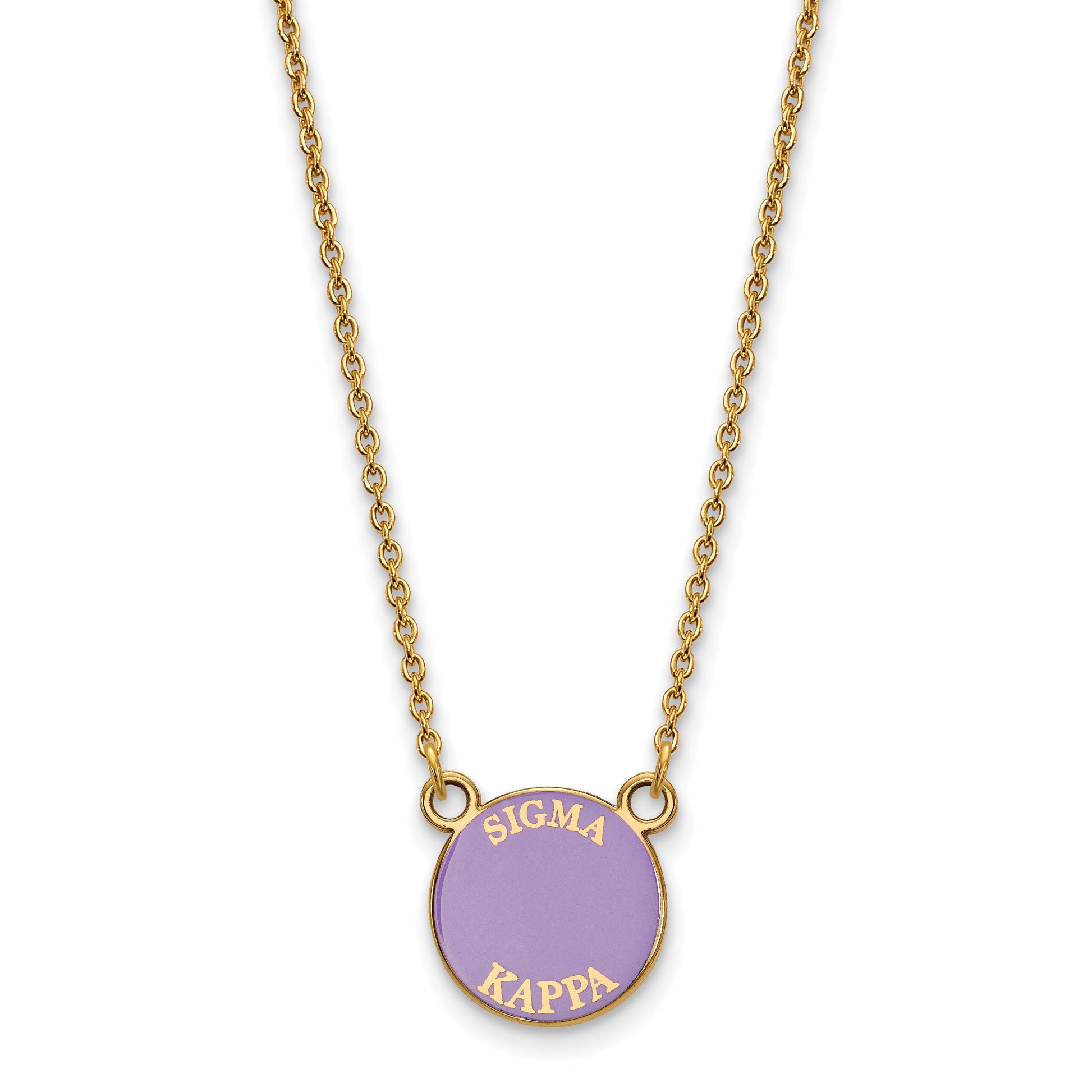 The Gold-Plated Sterling Silver Sigma Kappa Necklace is a must-have for sorority fans. Crafted from shiny sterling silver with a durable gold finish, this 18-inch chain adds style and pride. The pendant features the Sigma Kappa logo in vibrant purple and maroon enamel, giving it a bold look. Its small size and sleek design make it perfect for daily wear. Made with laser-cut details, this necklace combines quality with a simple charm. Whether for yourself or as a gift, the Sigma Kappa Gold-Plated Silver Necklace fits well with any outfit.