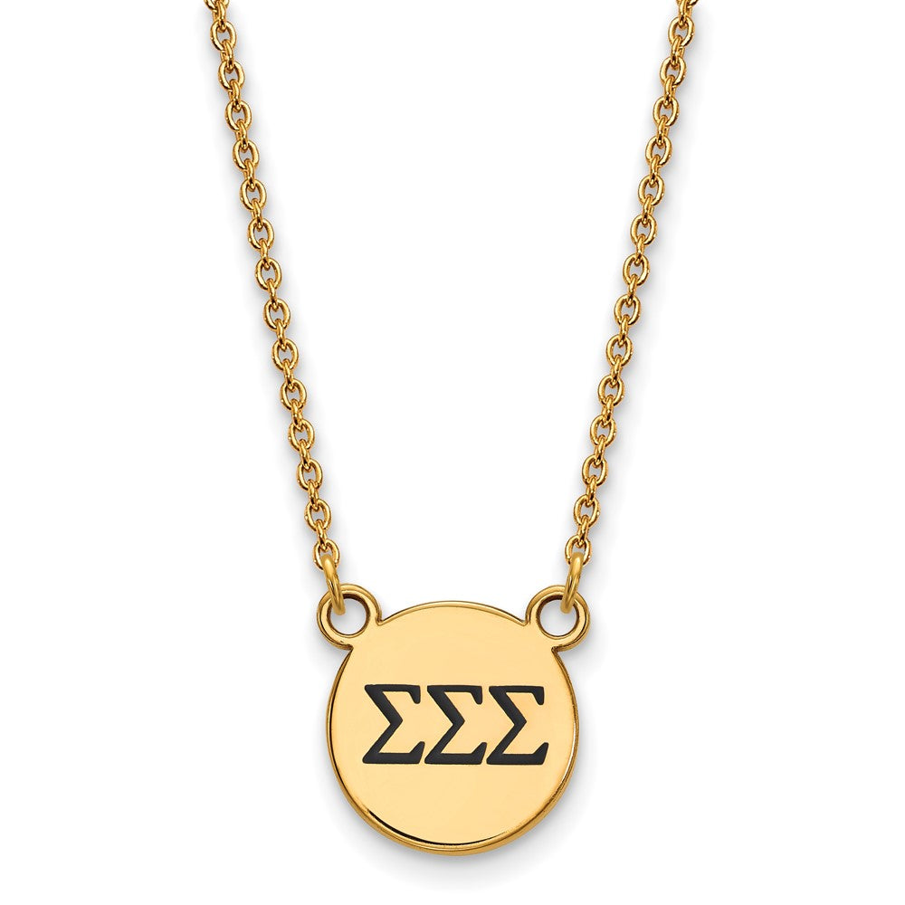 The LogoArt Sigma Sigma Sigma small black enamel pendant is a sleek addition to any jewelry collection. Crafted from sterling silver with a durable gold plating, this pendant measures 12 mm by 12 mm and features the iconic Greek letters for Sigma Sigma Sigma. The black enamel adds a bold touch, making it perfect for showing your sorority pride. Attached to an 18-inch chain, this piece offers a subtle yet clear statement of your sisterhood. LogoArt has licensed this design, ensuring quality and authenticity in every piece.