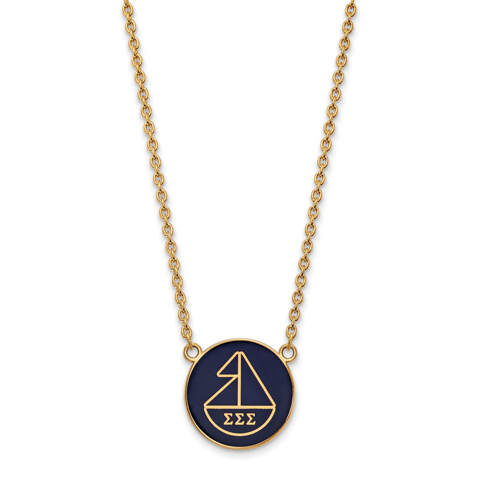 Show off your sisterhood with the LogoArt Sigma Sigma Sigma large enamel pendant. Crafted from quality sterling silver, it features a bright gold plating that adds a bold shine. The pendant measures 19 mm and hangs on an 18-inch chain, making it perfect for everyday wear. Its vivid enamel finish highlights the Sigma Sigma Sigma logo, letting you display your pride. Designed under license by LogoArt LLC, this jewelry piece combines durability with style. The LogoArt Sigma Sigma Sigma pendant makes a great gift or keepsake for any proud member of the sorority.