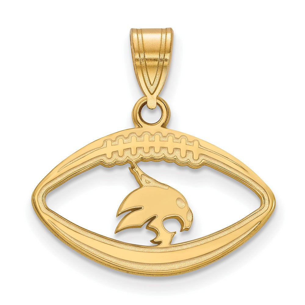 Show off your pride with the Ss/Gold Plated Sterling Silver Gold-Plated Logoart Texas State University Bobcat Football Pendant. Crafted from high-quality sterling silver, this pendant features a bright gold-tone finish for a bold look. Measuring 20 mm in length and 14 mm in width, it’s a perfect size for everyday wear. The laser-cut design highlights the iconic Texas State Bobcat logo, making it a stylish way to represent your school spirit. With a secure 6 mm bail, the pendant is built for comfort and durability. This Logoart jewelry piece truly captures your pride and loyalty.